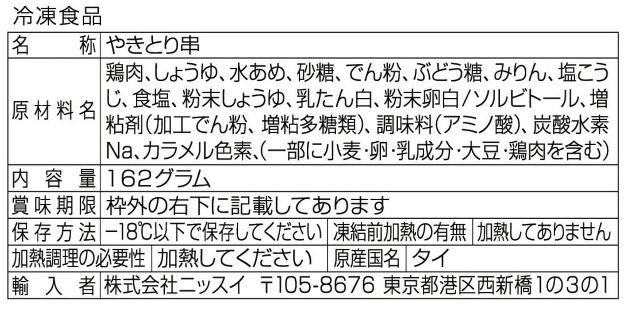 鶏肉、しょうゆ、水あめ、砂糖、でん粉、ぶどう糖、みりん、塩こうじ、食塩、粉末しょうゆ、乳たん白、粉末卵白/ソルビトール、増粘剤(加工でん粉、増粘多糖類)、調味料(アミノ酸)、炭酸水素Na、カラメル色素、(一部に小麦・卵・乳成分・大豆・鶏肉を含む)