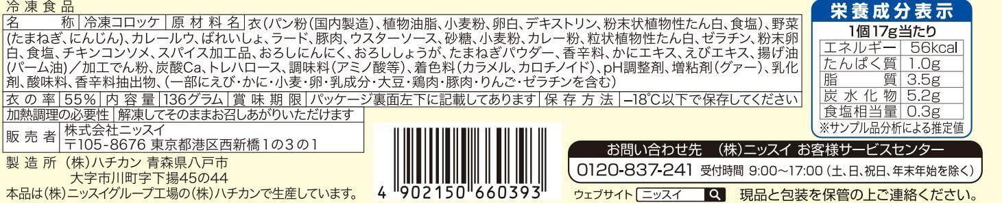 衣(パン粉(国内製造)、植物油脂、小麦粉、卵白、デキストリン、粉末状植物性たん白、食塩)、野菜(たまねぎ、にんじん)、カレールウ、ばれいしょ、ラード、豚肉、ウスターソース、砂糖、小麦粉、カレー粉、粒状植物性たん白、ゼラチン、粉末卵白、食塩、チキンコンソメ、スパイス加工品、おろしにんにく、おろししょうが、たまねぎパウダー、香辛料、かにエキス、えびエキス、揚げ油(パーム油)/加工でん粉、炭酸Ca、トレハロース、調味料(アミノ酸等)、着色料(カラメル、カロチノイド)、pH調整剤、増粘剤(グァー)、乳化剤、酸味料、香辛料抽出物、(一部にえび・かに・小麦・卵・乳成分・大豆・鶏肉・豚肉・りんご・ゼラチンを含む)