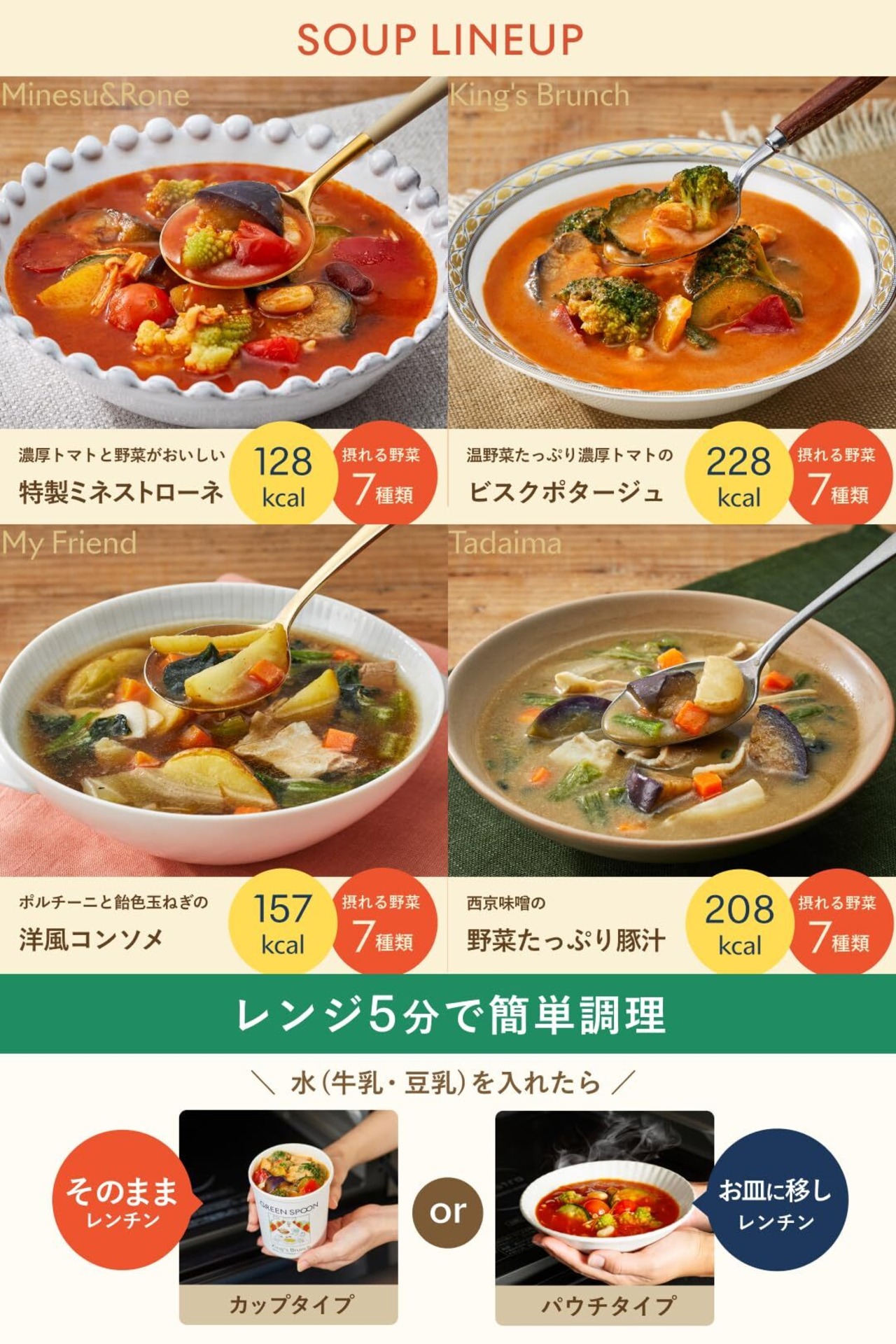 【セット内容】スープ4食入。Tadaima(西京味噌の野菜たっぷり豚汁):208kcal, My Friend(ポルチーニと飴色玉ねぎの洋風コンソメ):157kcal, King’s Brunch(温野菜たっぷり濃厚トマトのビスクポタージュ):222kcal, Minesu&Rone(濃厚トマトと野菜がおいしい特製ミネストローネ):128kcal。 賞味期限:製造日から364日。出荷時から1ヶ月以上。保存方法:要冷凍(-18℃以下)。