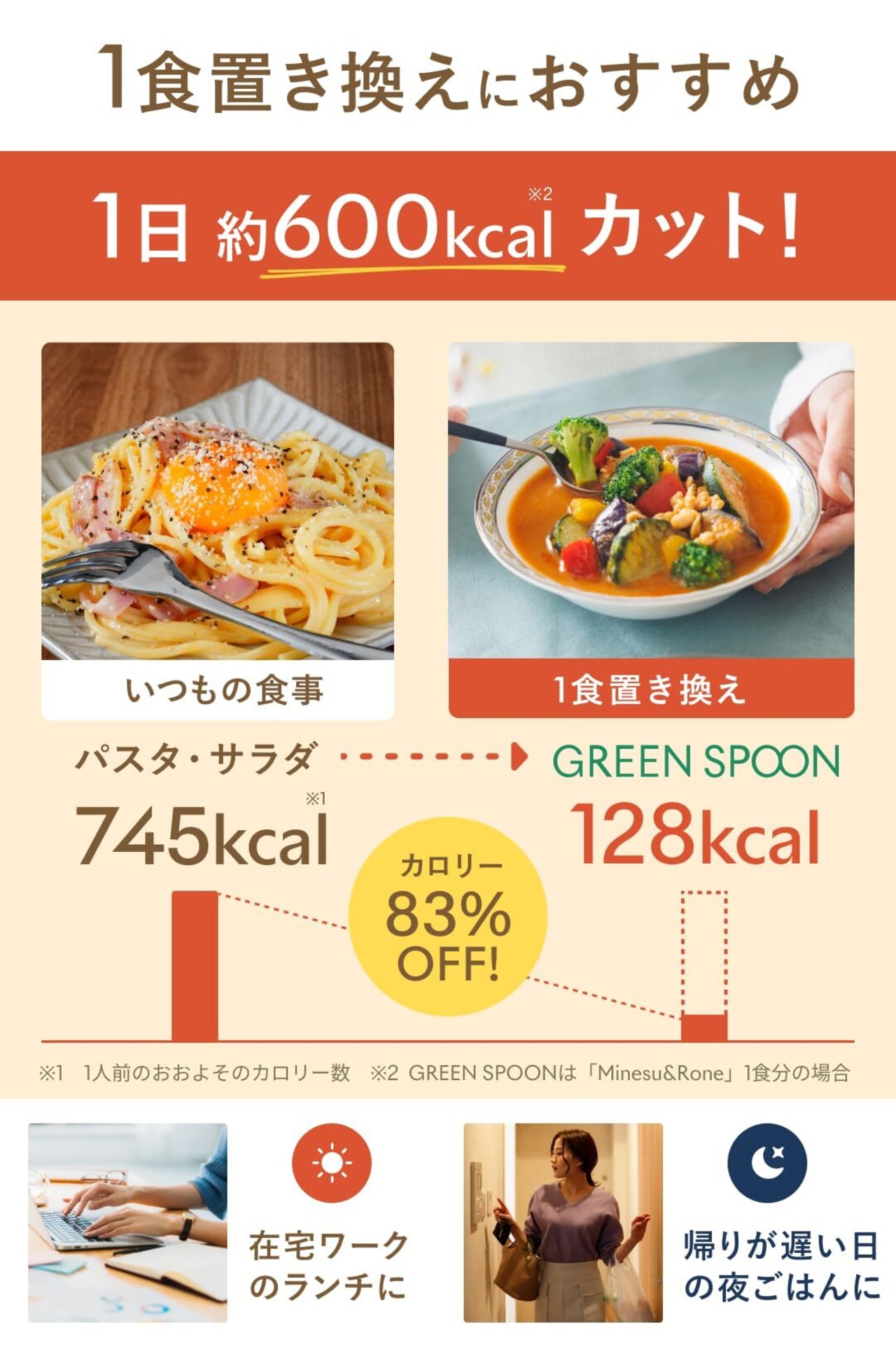 【ごろごろ野菜がぎっしり詰まった、1食になるスープごはん】レンジ5分で完成する、たっぷり野菜のスープごはん。1食で7種の野菜を含み、満足するボリュームの約300g、128kcal*と低カロリー&低糖質でヘルシーな1食に仕上げています。(*Minesu&Roneの場合)