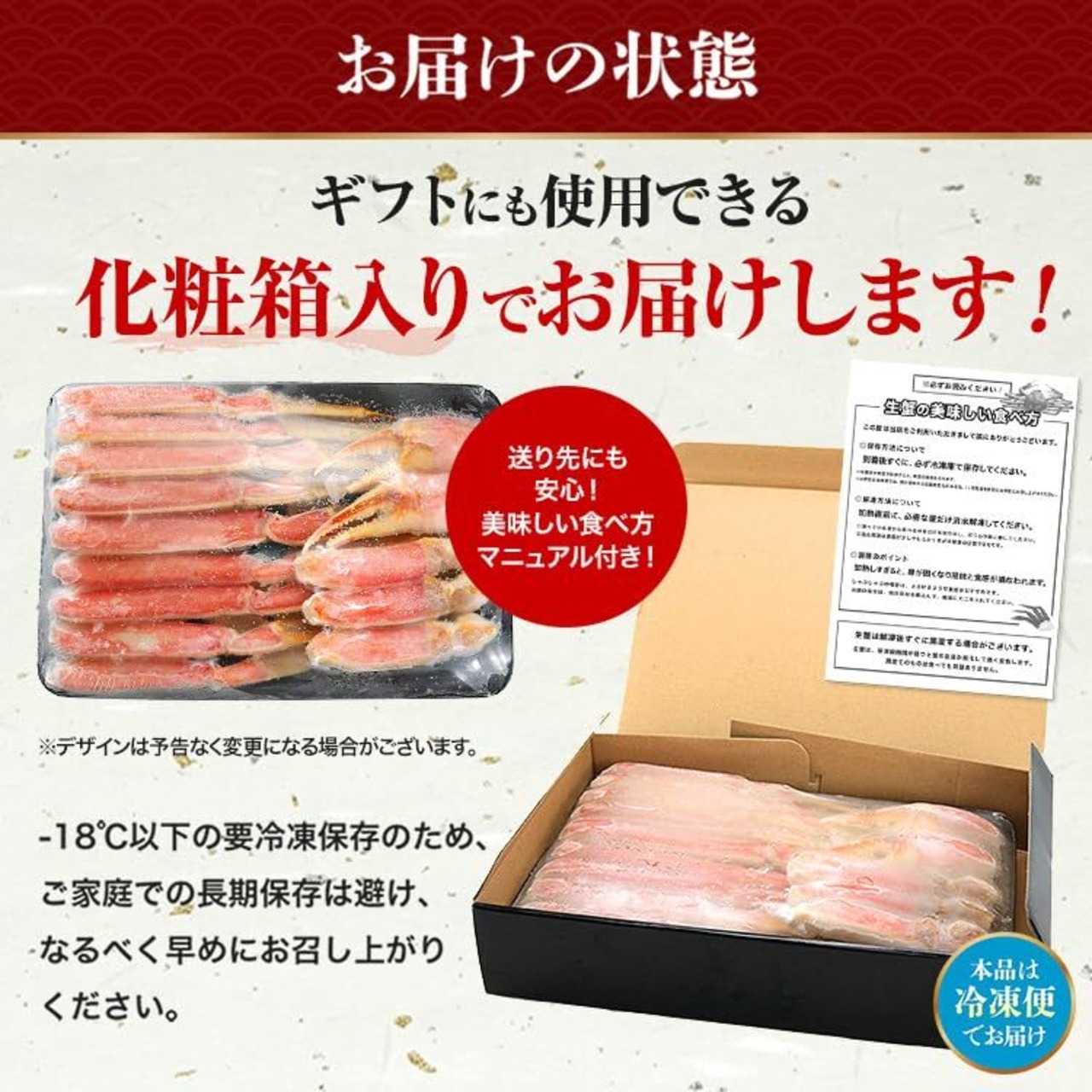 <商品説明> ○シンプルに旨い! 本ズワイガニを新鮮なまま、食べやすくカット 鮮度抜群のずわい蟹を丁寧に、蟹足の上半分の殻だけを食べやすくカットしています 全くむいていない蟹は、はさみがいる、時間がかかり食べにくい、全むきのポーションは、風味が足りない。。。という不満を解決できるのが、カット済みです! 鍋や蟹しゃぶはもちろん焼蟹、天ぷらでもOK! はさみや包丁など不要で、だれでも簡単に調理できます。 生の蟹なので良い出汁が出て最後の雑炊が絶品 もちろん身入り甘みは自信有り!店長オススメの蟹を存分にご堪能下さい!