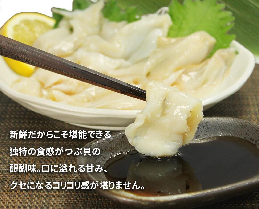 獲れたてのつぶ貝を急速冷凍、旨味をギュッと閉じ込めました。食べやすいように全てお刺身用にカット。冷蔵庫で自然解凍するだけで、本格つぶ貝のお刺身が完成。トレー真空パックなので、冷凍庫で保存すればいつでも新鮮なお刺身が楽しめます。