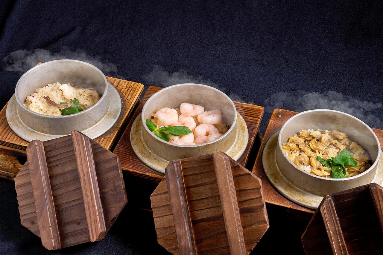 [鯛の出汁で炊く鯛釜めし×1品] 新鮮な鯛だけを使った素材の旨味が光る鯛出汁の釜めし。 出汁はかつお、昆布、貝柱をベースに鯛の頭や骨から出汁をとっているので、より滋味あふれる味わいです。 [生姜薫る。浅蜊の釜めし×1品] 東京の郷土料理「深川めし」をイメージした釜めしです。 浅蜊の旨みをきっちりと取り出し、 閉じ込めた相性の良い生姜とともにふっくらと炊き上げました。