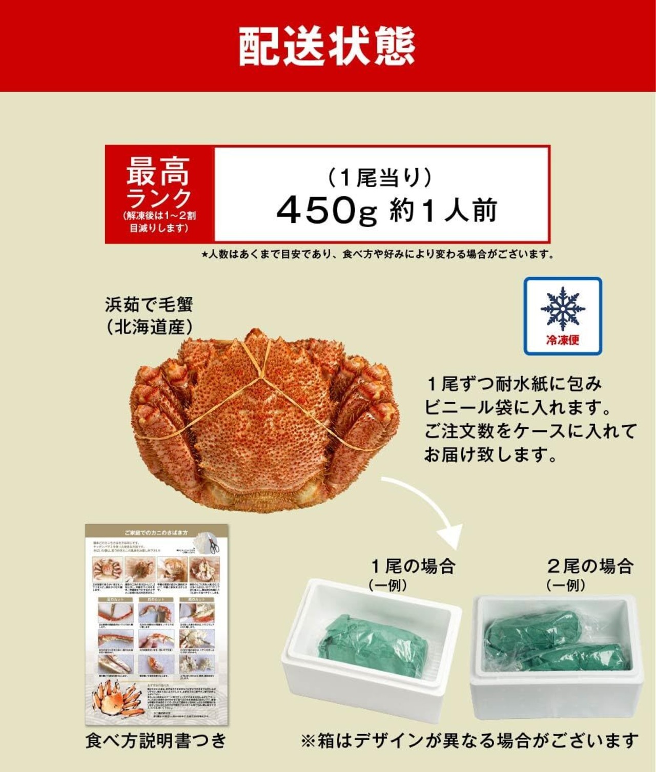 内容量:毛がに 450g前後 x 1ハイ ※冷凍時の重量です。解凍後は1~2割目減りします。