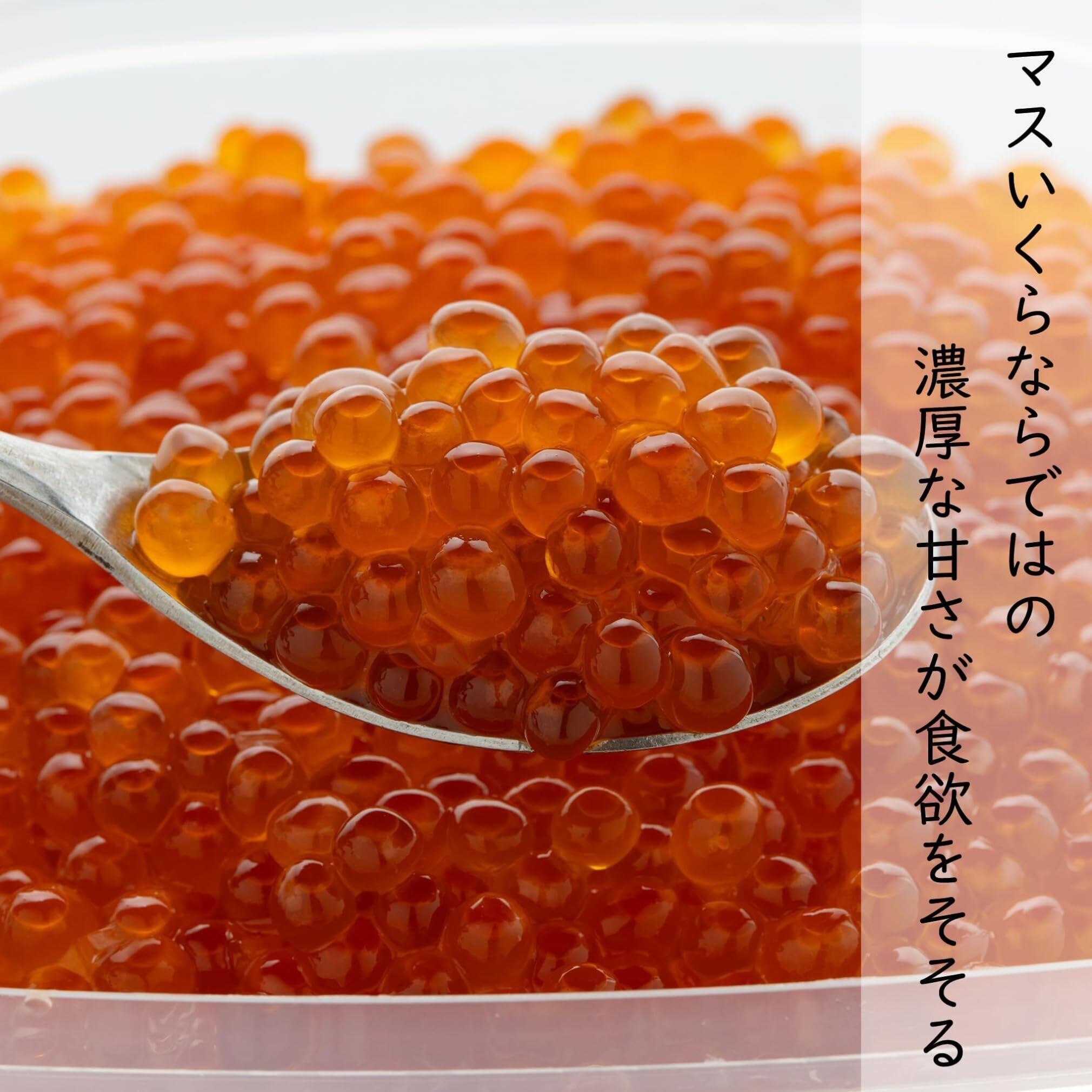 【マスいくらならではの濃厚な甘さが食欲をそそる】サケいくらにくらべるとマスいくらは若干粒の大きさが小さくなりますが、サケいくらよりも甘みが強く濃厚。皮が薄いので舌に皮が残りにくいのも特徴です。マスいくらの滑らかな舌触りと濃厚な甘さを味わったらもう箸が止まりません。