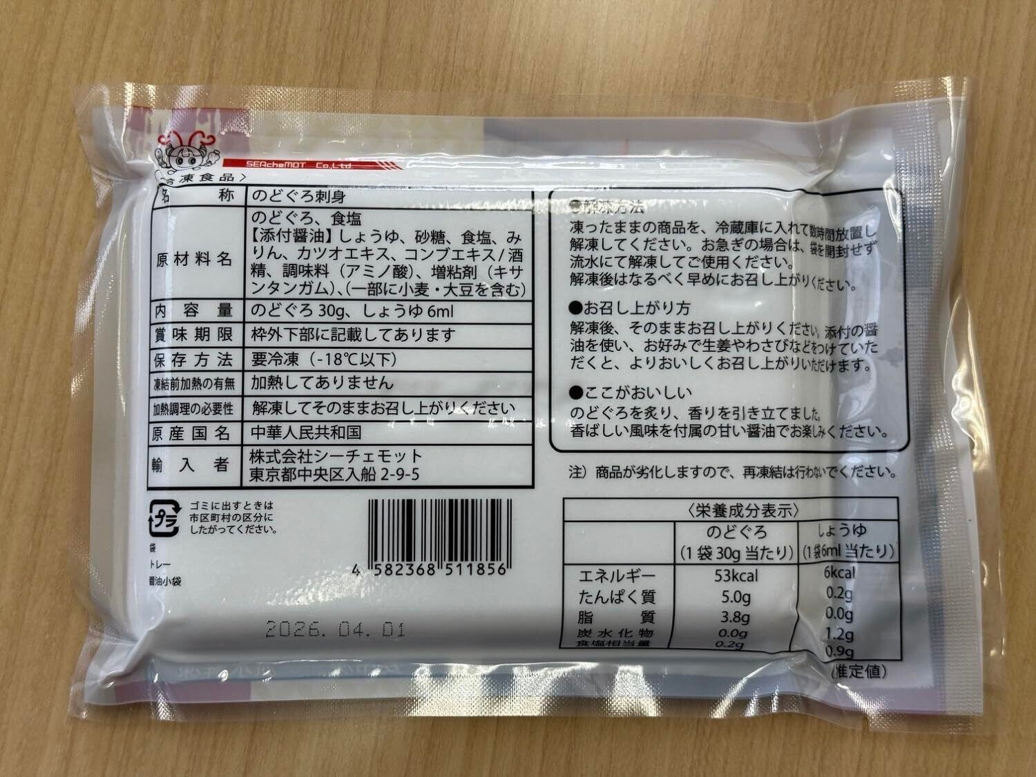 脂がのって美味しい高級魚として有名な『ノドグロ』のお刺身です。皮目をしっかりと炙った風味も楽しめます。お醤油パックもついているので、キャンプやピクニックで刺身が食べれる。薄いパッケージが冷凍庫内でかさ張らないので、あと一品欲しいときに流水解凍3分で献立にプラスワン。他の種類と合わせて贅沢に海鮮丼にしてもおいしい!