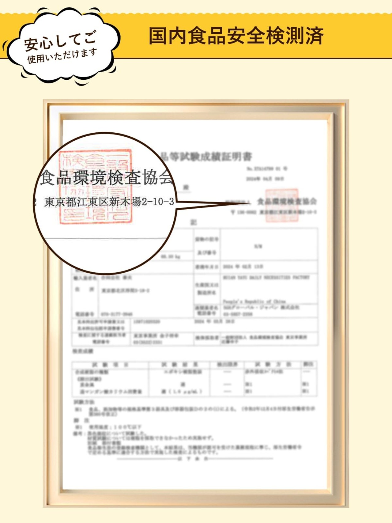【安心の品質1年】国内での食品安全検査をクリアした信頼できる品質を誇る商品です。万が一、商品に不具合があった場合は、カスタマーサービスセンターまでご連絡ください。商品交換や再送など、迅速に対応させていただきます。