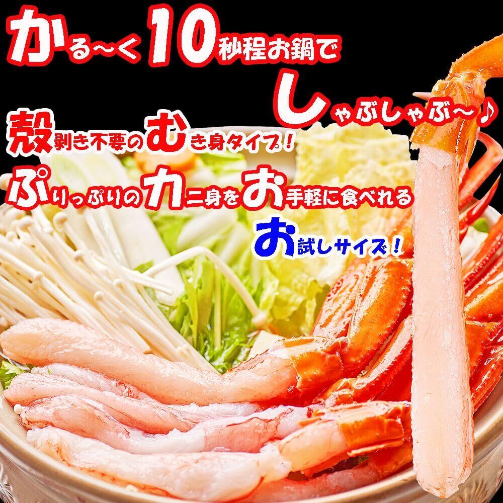 ・本品は1袋500g(16~20本)入りです。お試しサイズでむき身の可食部は8~10cm程度になります。特大ではないですが、鮮度と味わいはしっかりした逸品です。カニ身はぷりっぷりでお手軽に食べれるサイズになっておりますので、是非、ご家族皆さんでご賞味ください。