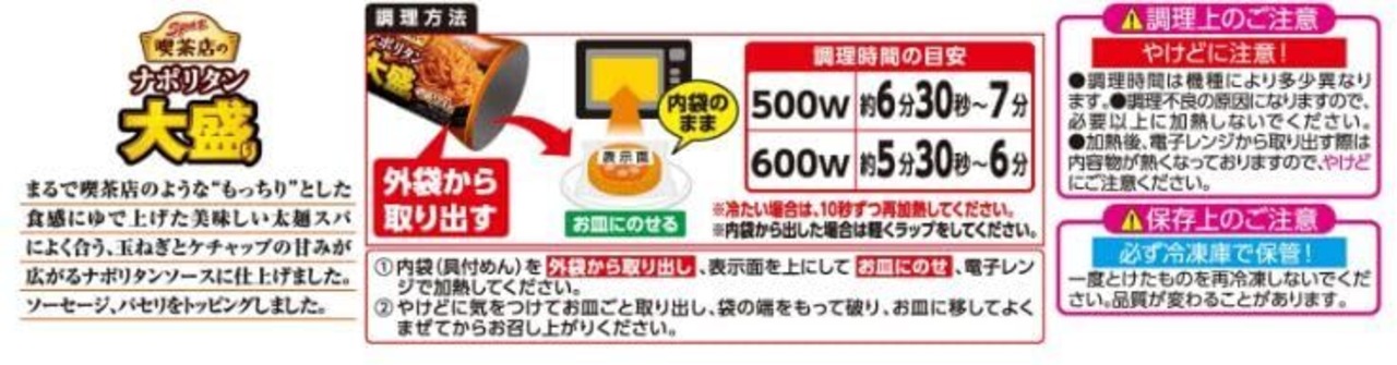 めん〔小麦粉(国内製造)、食塩、卵粉、酵母/調味料(アミノ酸)、クチナシ色素、パプリカ色素〕、トマトペースト、植物油脂、トマトケチャップ、砂糖、ソテーオニオン、野菜調味油、食塩、ファットスプレッド、ソーセージ、にんじん、オニオンパウダー、酵母エキス、香辛料、乾燥たまねぎ/増粘剤(加工でん粉)、調味料(アミノ酸等)、香料、加工でん粉、酸味料、パプリカ色素、リン酸塩(Na)、カラメル色素、酸化防止剤(ビタミンC)、発色剤(亜硝酸Na)、カロテン色素、香辛料抽出物、(一部に小麦・卵・乳成分・大豆・鶏肉・豚肉を含む)
