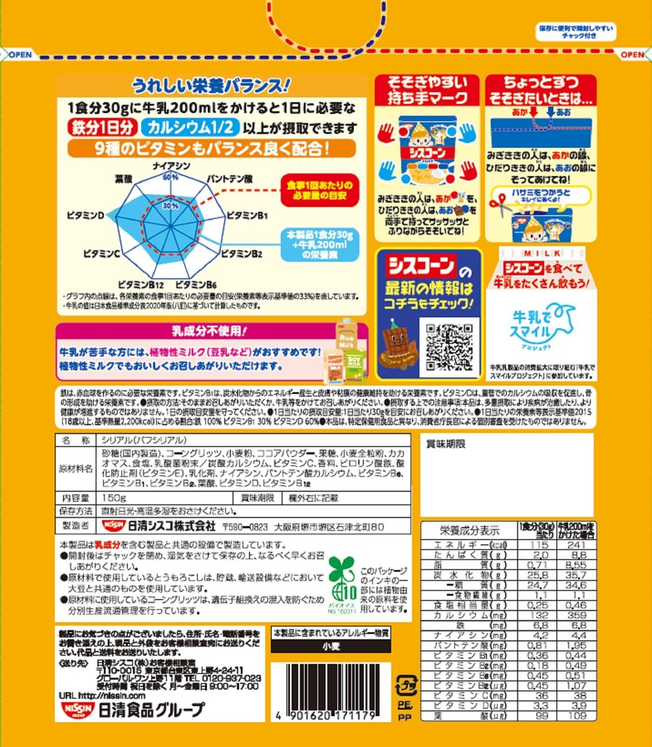 シスコーンは2023年で発売60周年を迎えたロングセラーブランドです。サクサク楽しい食感のパフシリアルです。1食分30gに牛乳200mlをかけて食べると、1日分の鉄分、1日に必要なカルシウムの1/2、9種類のビタミンの1/3以上が摂取できます。大人だけでなくお子様も使いやすいように「右利き」「左利き」の持ち手マークと開け方提案を記載しており、忙しい朝に自分で朝食を用意するきっかけづくりができます。※お召し上がりの際はお手元の商品裏面をよくご確認ください。