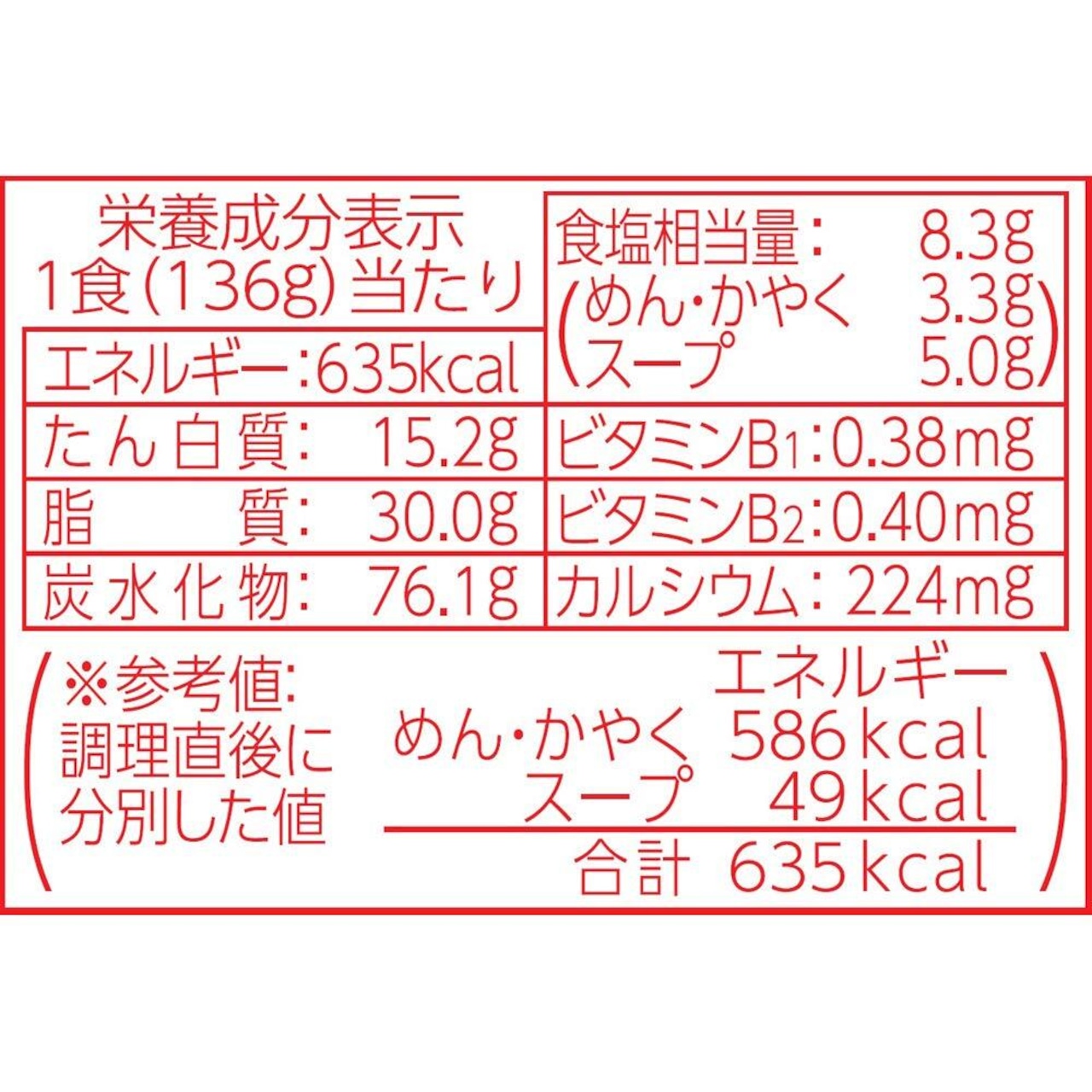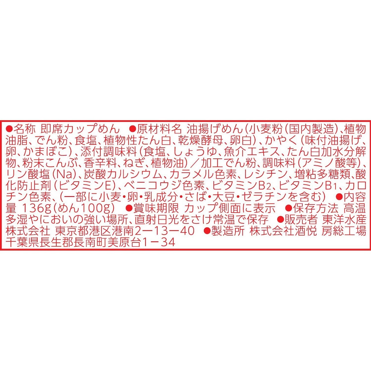 【商品詳細】内容量:136g×12個 / 商品サイズ(高さx奥行x幅):175mm×346mm×508mm / 総パッケージ重量: 2.1 kg / 原材料:油揚げめん(小麦粉(国内製造)、植物油脂、でん粉、食塩、植物性たん白、乾燥酵母、卵白)、かやく(味付油揚げ、卵、かまぼこ)、添付調味料(食塩、しょうゆ、魚介エキス、たん白加水分解物、粉末こんぶ、香辛料、ねぎ、植物油)/加工でん粉、調味料(アミノ酸等)、リン酸塩(Na)、炭酸カルシウム、カラメル色素、レシチン、増粘多糖類、酸化防止剤(ビタミンE)、ベニコウジ色素、ビタミンB2、ビタミンB1、カロチン色素、(一部に小麦・卵・乳成分・さば・大豆・ゼラチンを含む)
