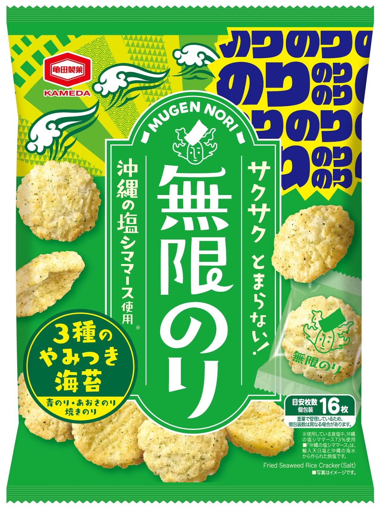 子どもから大人まで家族みんなのおやつとして食べられる「無限シリーズ」からのり塩味が登場。3種のやみつき海苔とやさしい塩味のスナック感覚で止まらない美味しさです