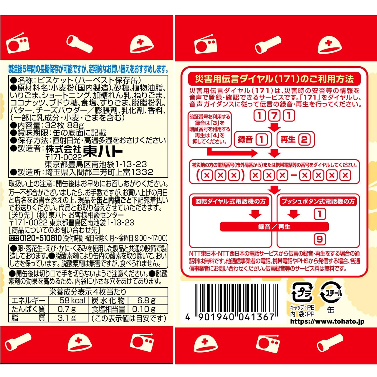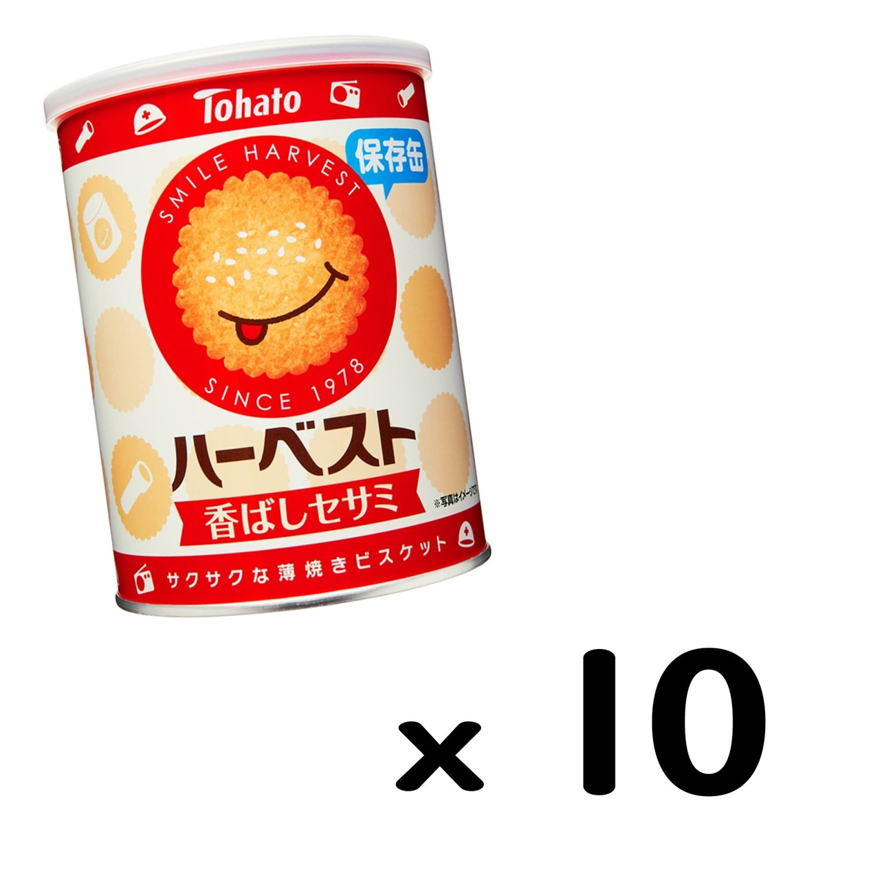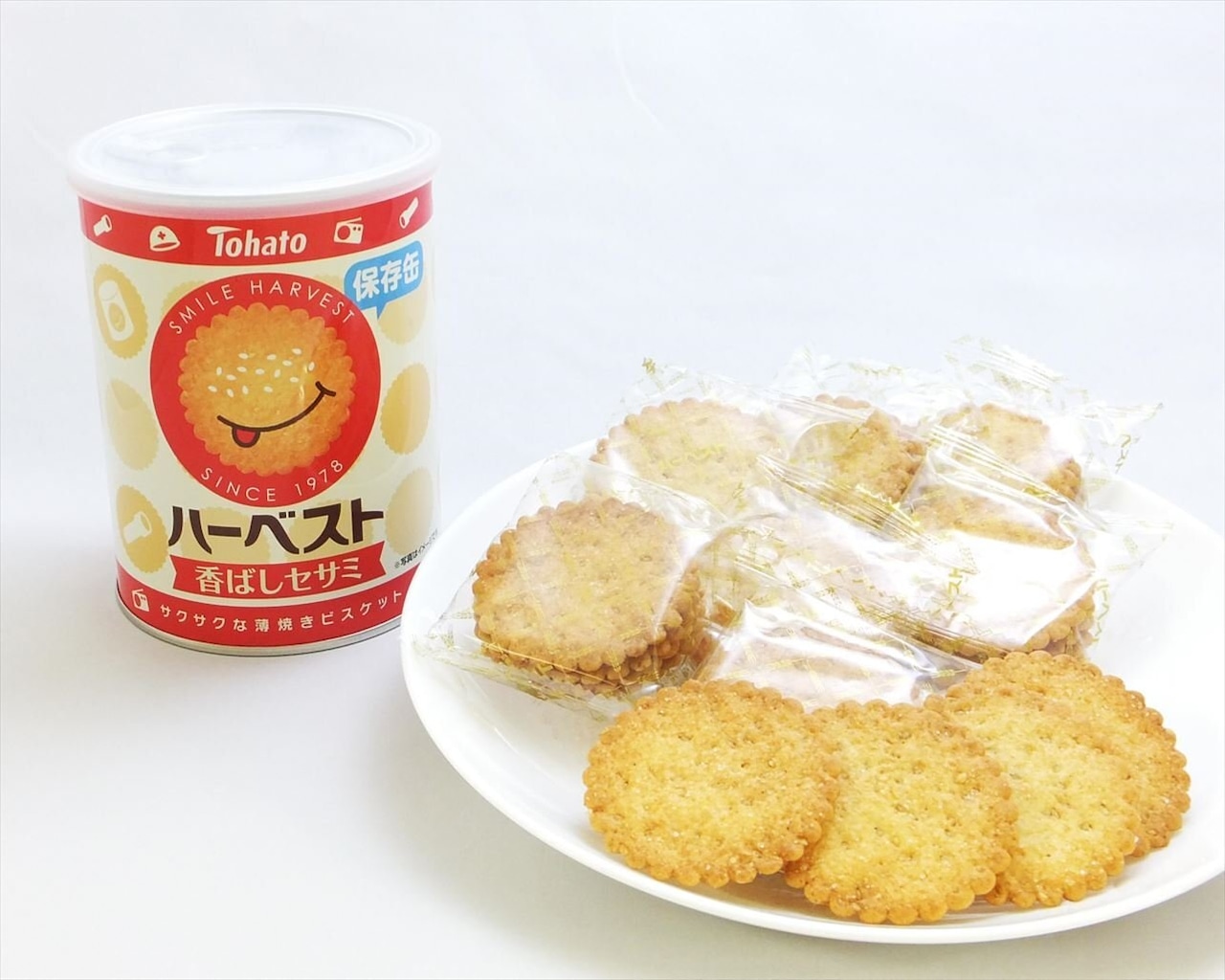 遠赤焙煎製法で煎った焙煎ゴマと 、アクセントに発酵バターを加えて焼きあげた、ハーベスト香ばしセサミの長期保存用缶タイプです。風味豊かなゴマの味わいがお楽しみ頂けます。株式会社東ハトは、東京都豊島区南池袋に本社を置くビスケット・スナックを製造する菓子メーカーです。主な商品はキャラメルコーン、ポテコ、ハーベスト、オールレーズン、暴君ハバネロ等多くの商品を発売しております。