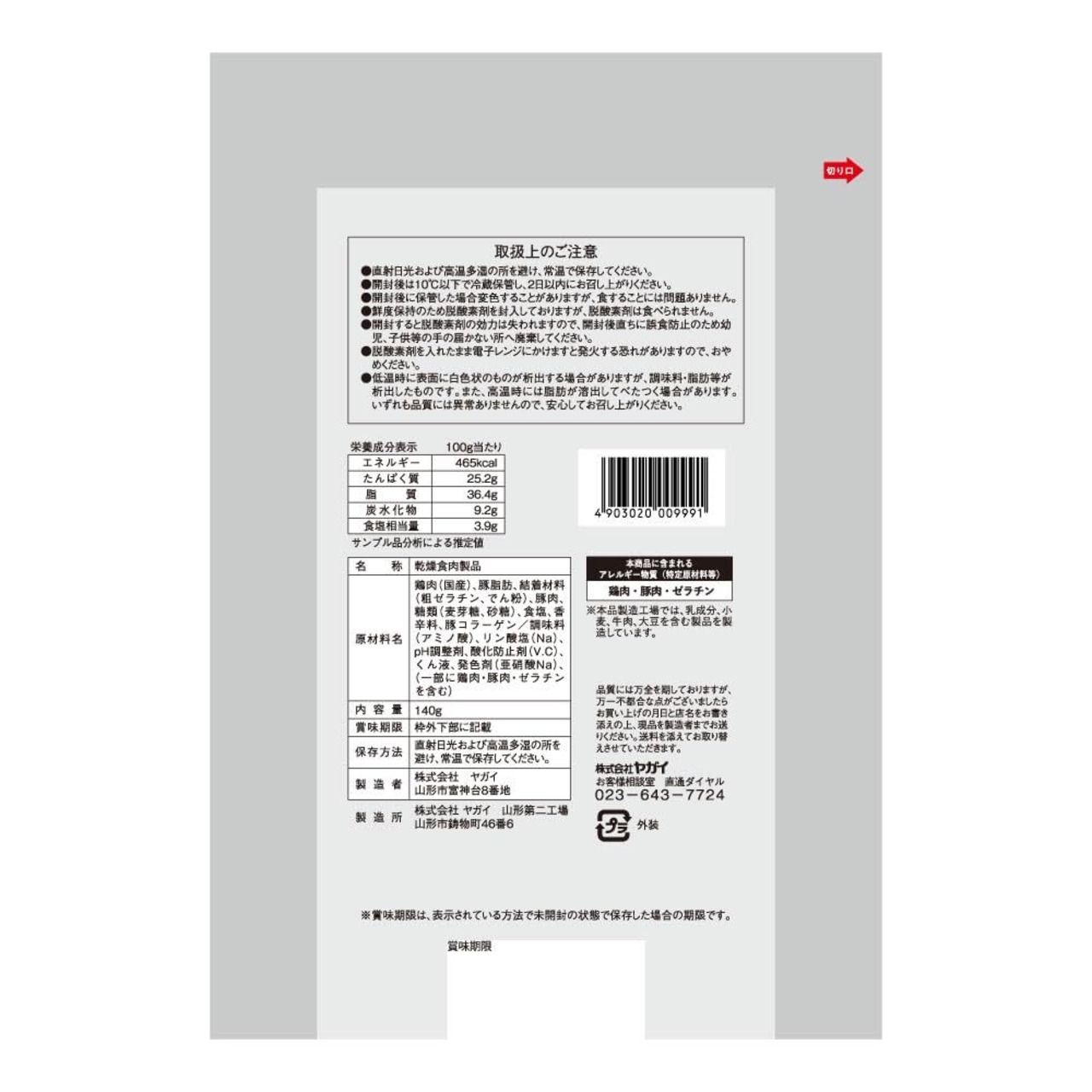 原材料:鶏肉(国産)、豚脂肪、結着材料(粗ゼラチン、でん粉)、豚肉、糖類(麦芽糖、砂糖)、食塩、香辛料、豚コラーゲン/調味料(アミノ酸)、リン酸塩(Na)、pH調整剤、酸化防止剤(V.C)、くん液、発色剤(亜硝酸Na)、(一部に鶏肉・豚肉・ゼラチンを含む)