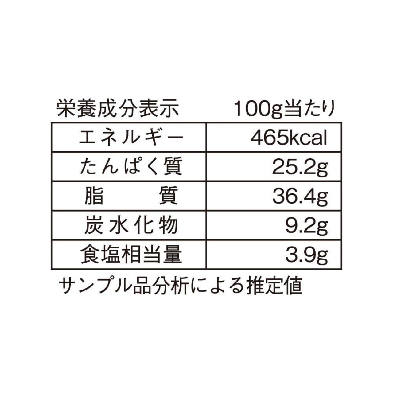 1袋(100g)当たり エネルギー465kcal、たんぱく質25.2g、脂質36.4g、炭水化物9.2g、食塩相当量3.9g