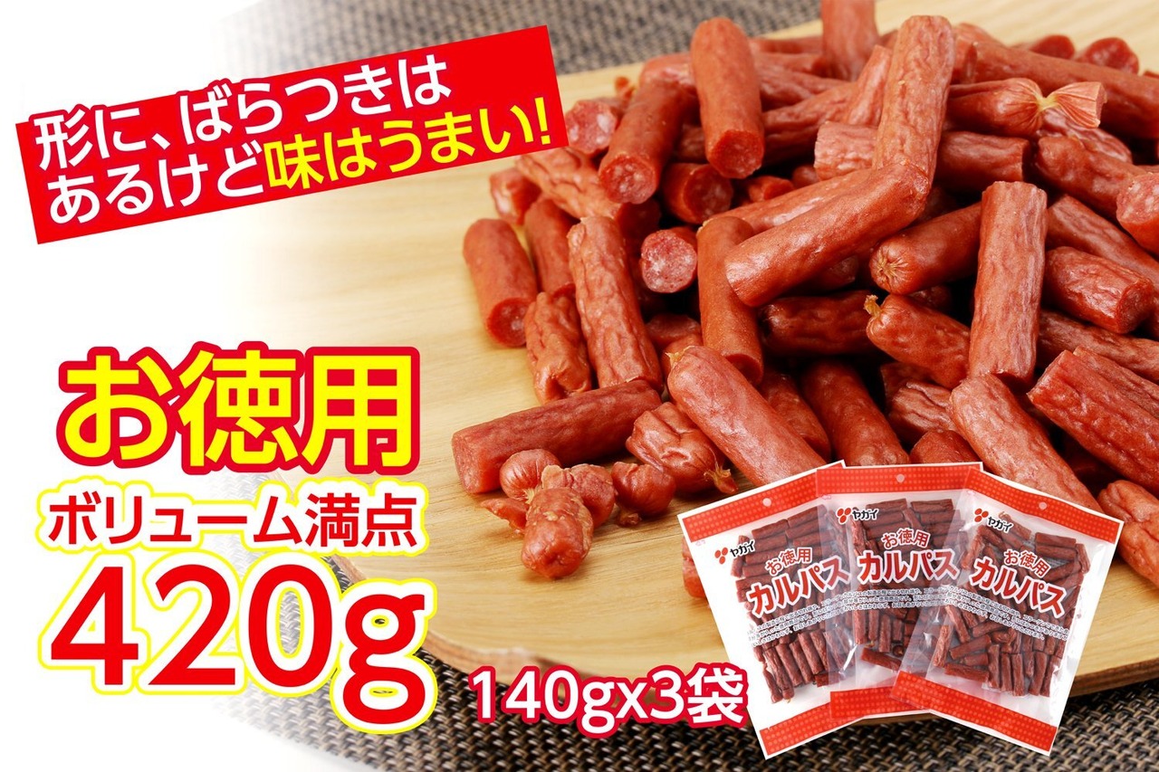 カルパスの製造工程で出る切れ端や、コラーゲンでできた皮の部分等が入った徳用商品です。形にばらつきがありますが、おいしさはかわらず、お召しあがりいただけます。