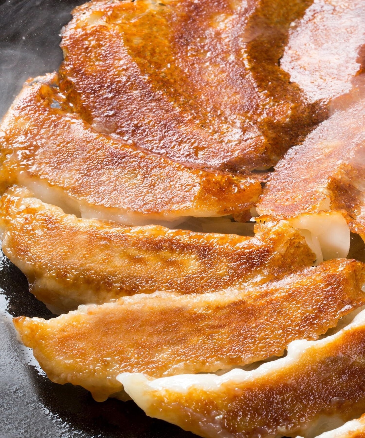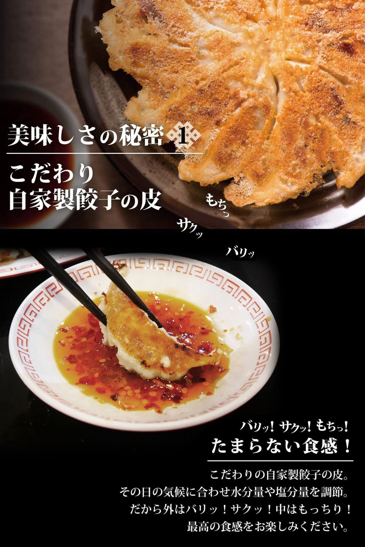 【美味しさの秘密①自家製餃子の皮】独自ブレンドしたの打ち粉を使用した、こだわりの自家製餃子の皮。その日の気候に合わせ、職人が水分量や塩分量を変えながら作っています。だから外はサクッと、中はもちっと。たまらない食感をご家庭でお楽しみください。