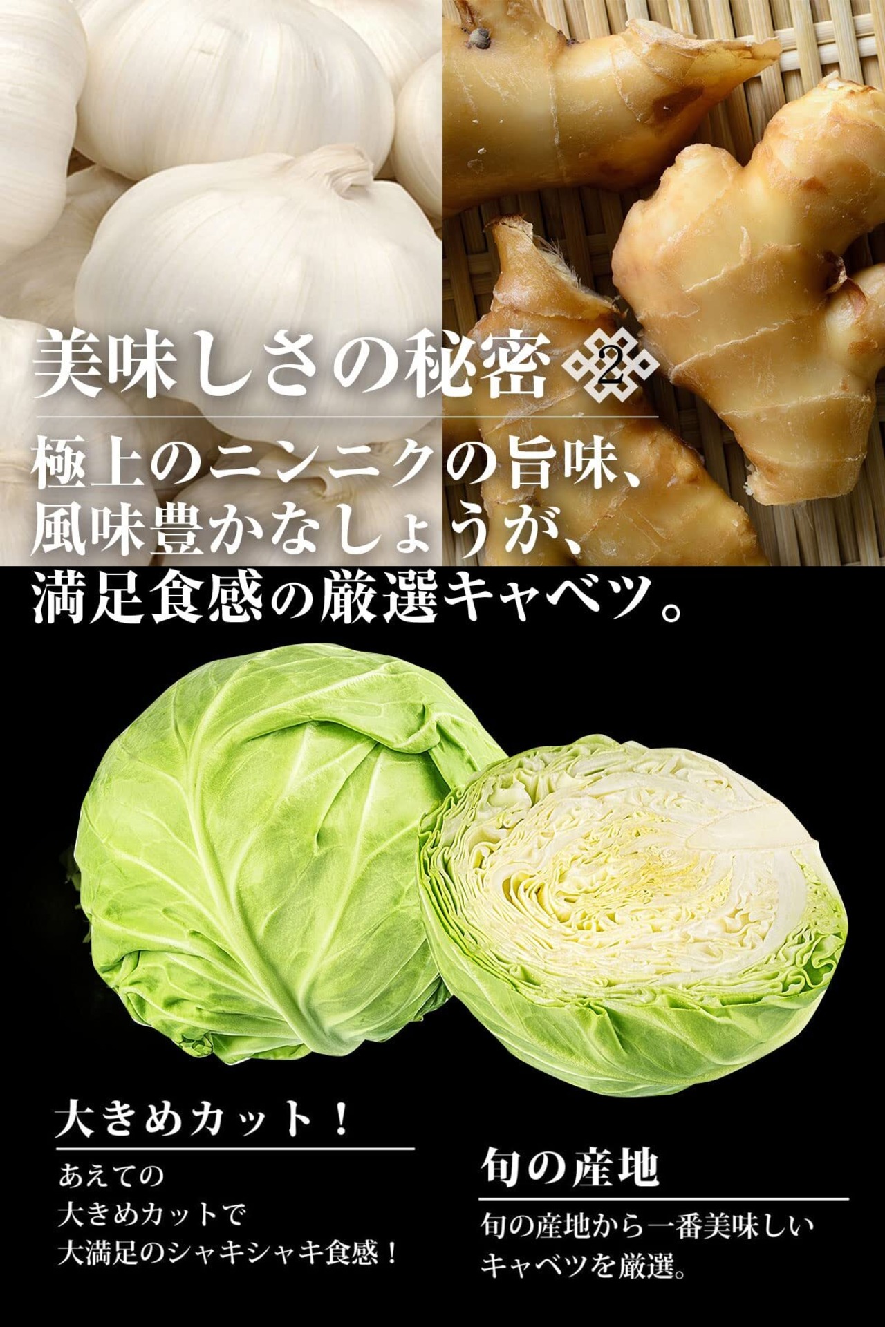 【美味しさの秘密②厳選食材で満足食感】当店のバイヤーが、その時期一番美味しいキャベツを旬の産地から厳選。あえて大きめにカットすることで、こだわりのシャキシャキ食感を生み出します。