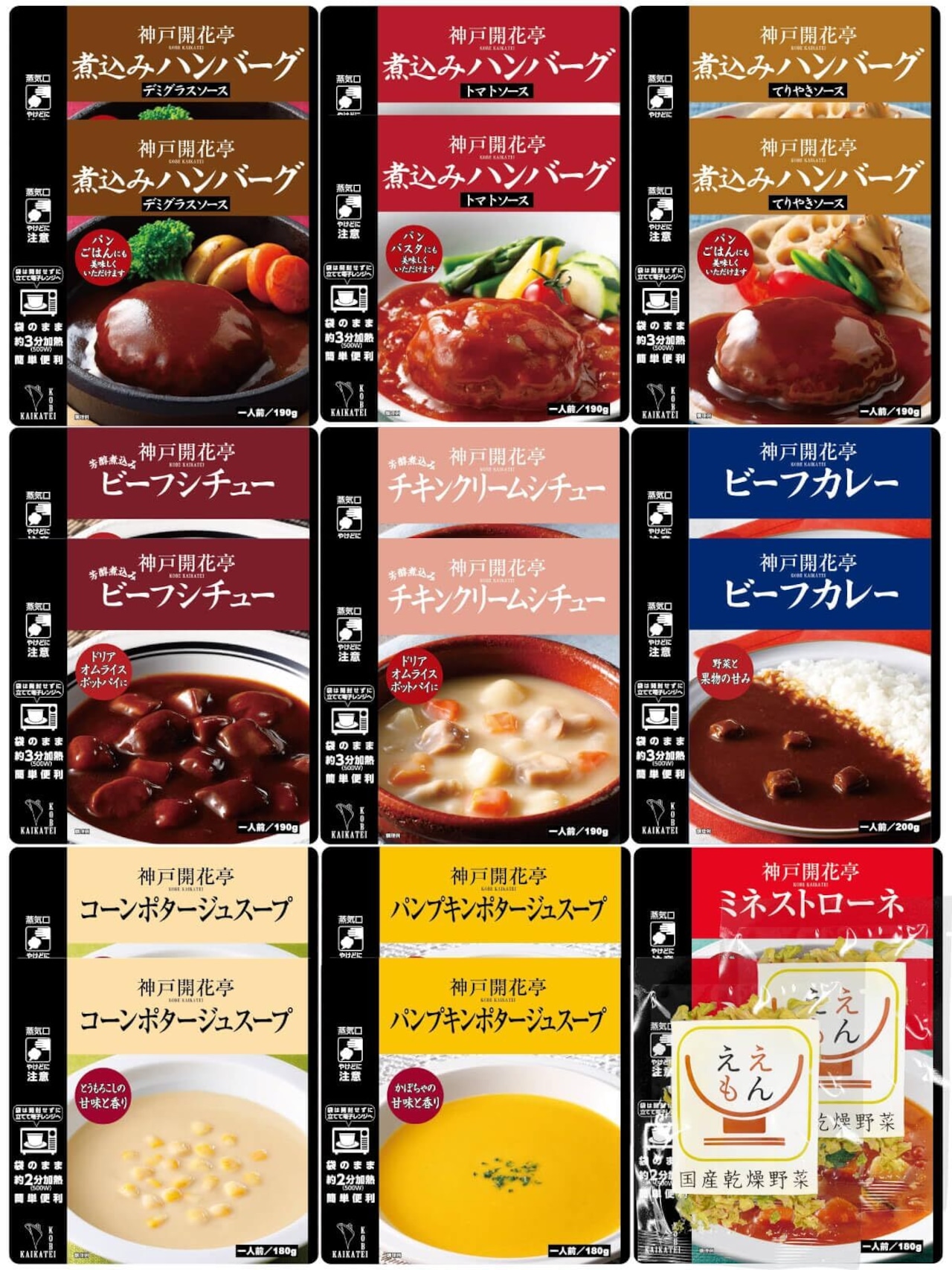 神戸開花亭 こだわり ソース の 煮込みハンバーグ と シチュー カレー スープ の 人気 詰め合わせセット 。 ご飯 や パン 、 パスタ にもよく合う、 本格 洋食 レストラン の 味 を 自宅 でも 簡単 に 楽しめます。