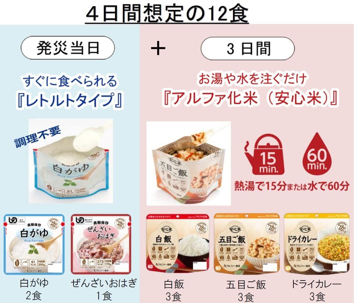 発災当日(調理不要・水不要でそのまま食べられるレトルトタイプ3食分)+3日間(お湯や水を注ぐだけで食べられるアルファ化米9食分)=計1人あたり4日間×3食分の主食の備蓄を想定した、お米の12食セットです。