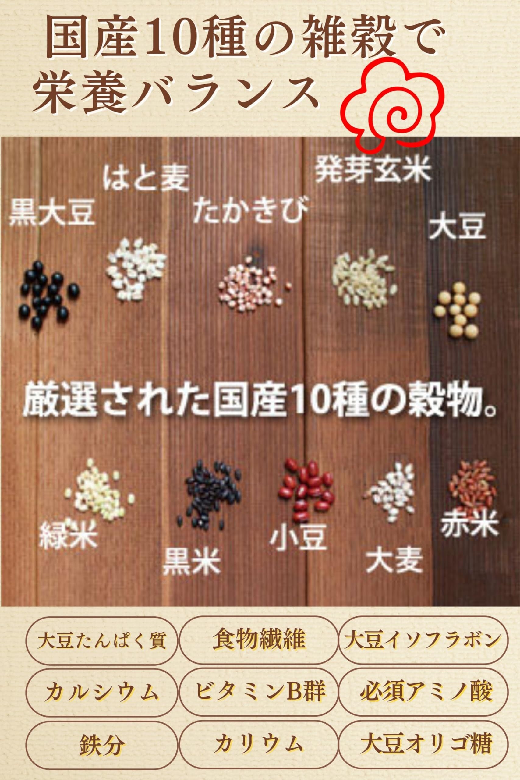 大麦、大豆(遺伝子組換えでない)、小豆、黒米、発芽玄米、たかきび、黒大豆(遺伝子組換えでない)、赤米、はと麦、緑米、食塩、米酢
