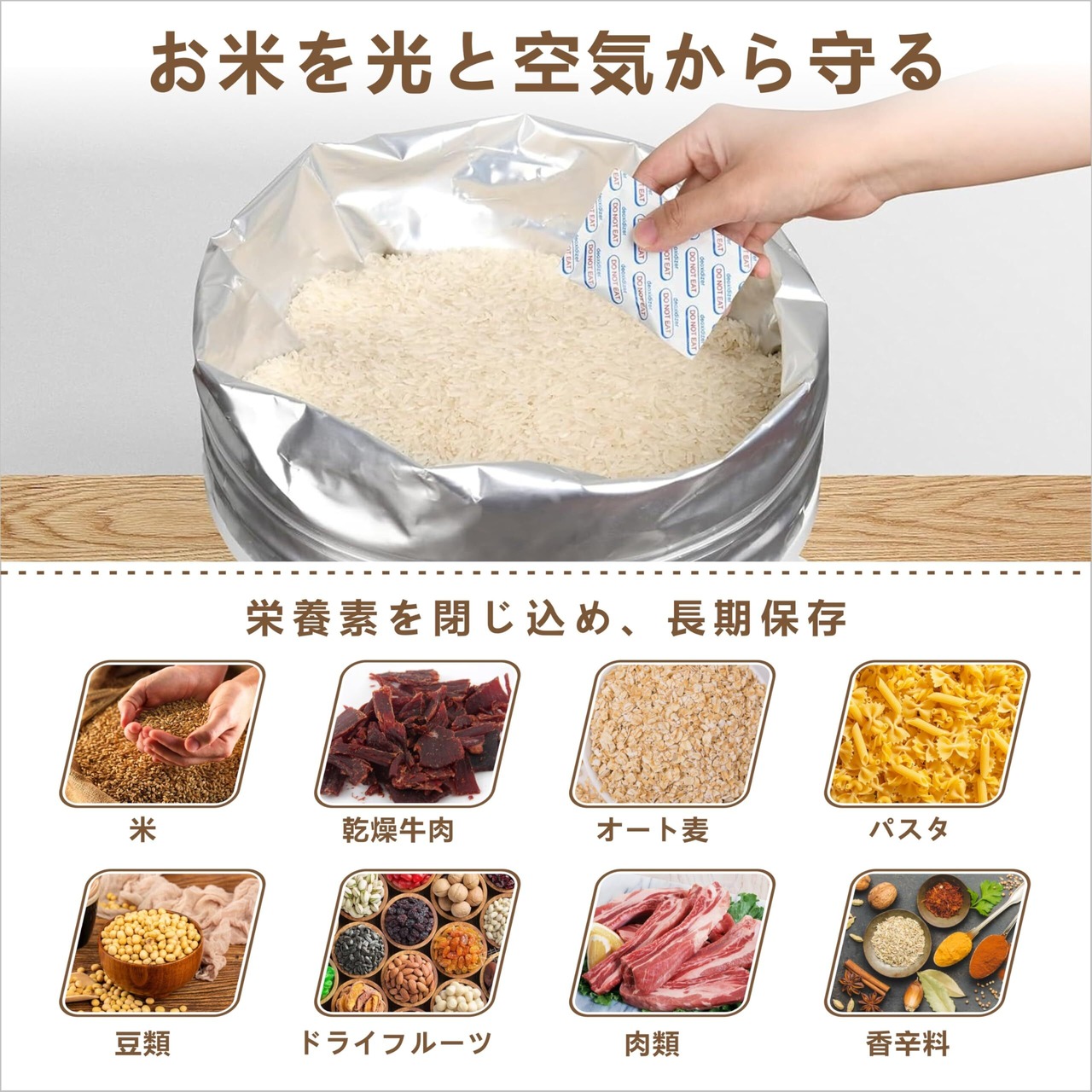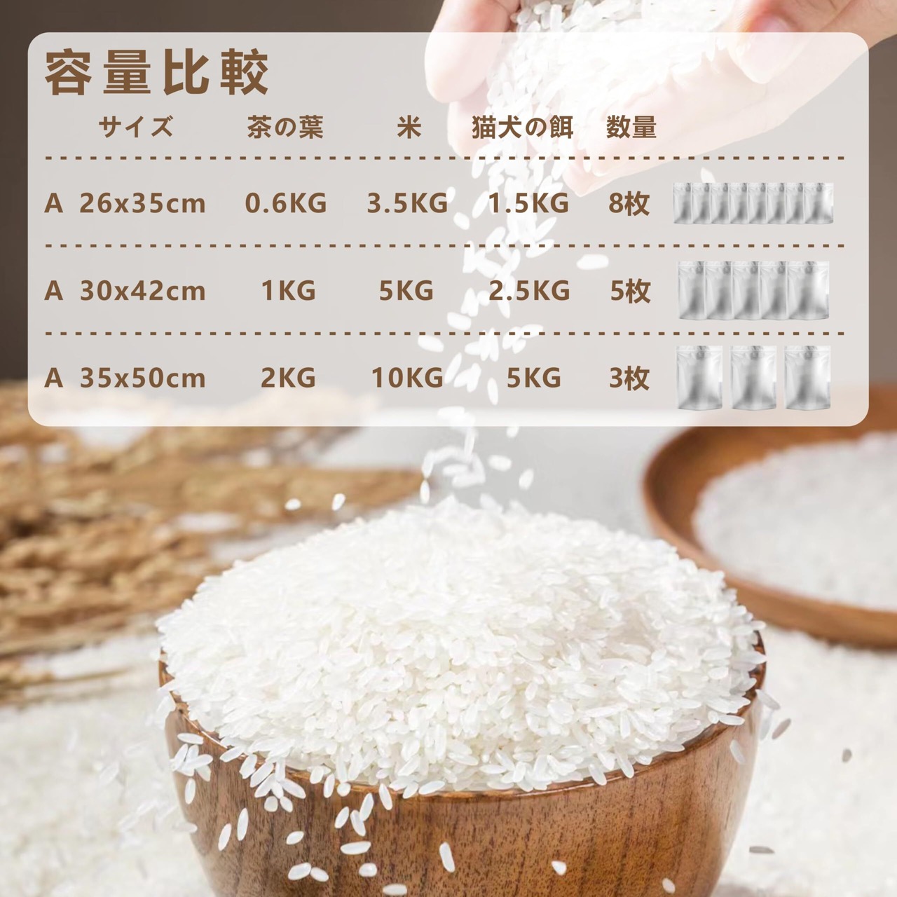 【お得なセット】お米保存袋は、食品の新鮮さを最大限にします。お米の保存に最適な3タイプのセットを用意しています。Aセット(3~3.5kg用)、Bセット(5~6kg用)、Cセット(9~10kg用)の各セットがお買い求めいただけます。お米の量に合わせて選ぶことができます。