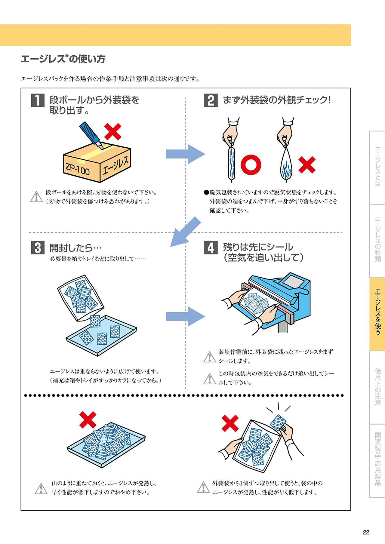 適用範囲(Aw):0.65~0.95 脱酸素日数:1~2日 酸素吸収量:100ml(空気量:500ml) 耐油性:脱酸素剤の小袋に、油で濡れにくい性質の包材を使用しています。 ご注意:使用済みの脱酸素剤は有効性が失われていることがありますので、再使用できません。無酸素パックを作りに、脱酸素剤エージレス及びバリア袋が必要です。