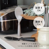 この杓文字は立つ機能があり、縦置き、横置きで自立させることができます。立てて置くことでしゃもじケースやしゃもじ置きいらずで小さいスペースに収納できます。104Lab.のたつしゃもじは食洗器対応のキッチンツールです。