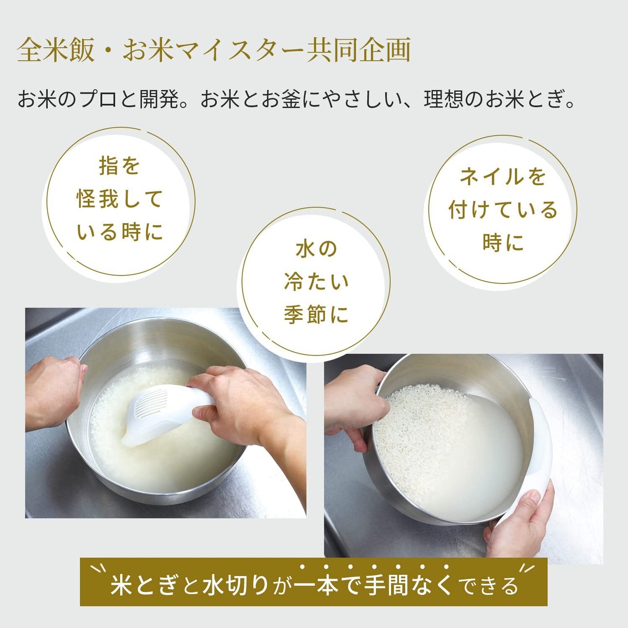 【使い方のポイント】「1」お米が全部使るくらいに水を入れ、やわらかい先端部分で軽く1~2回かき混ぜる 「2」釜の縁に取っ手の凹みをそわせるように入れて、中央のスリット部分を使って素早く水を切る。※あまり勢いよく水を入れるとあふれてしまうことがあるのでご注意ください。 「3」水がない状態で20回程度かき回す 「4」水を入れてひと回しする 「5」水を捨てる