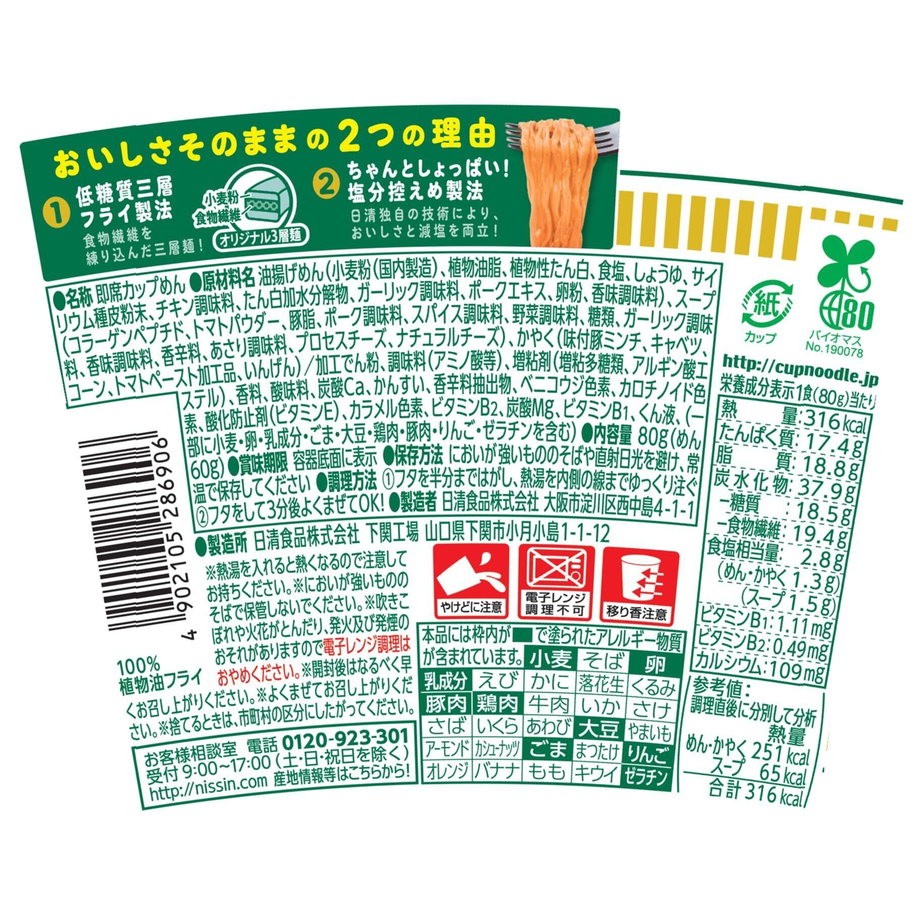 油揚げめん(小麦粉(国内製造)、植物油脂、植物性たん白、食塩、しょうゆ、サイリウム種皮粉末、チキン調味料、たん白加水分解物、ガーリック調味料、ポークエキス、卵粉、香味調味料)、スープ(コラーゲンペプチド、トマトパウダー、豚脂、ポーク調味料、スパイス調味料、野菜調味料、糖類、ガーリック調味料、香味調味料、香辛料、あさり調味料、プロセスチーズ、ナチュラルチーズ)、かやく(味付豚ミンチ、キャベツ、コーン、トマトペースト加工品、いんげん)/加工でん粉、調味料(アミノ酸等)、増粘剤(増粘多糖類、アルギン酸エステル)、香料、酸味料、炭酸Ca、かんすい、香辛料抽出物、ベニコウジ色素、カロチノイド色素、酸化防止剤(ビタミンE)、カラメル色素、ビタミンB2、炭酸Mg、ビタミンB1、くん液、(一部に小麦・卵・乳成分・ごま・大豆・鶏肉・豚肉・りんご・ゼラチンを含む)