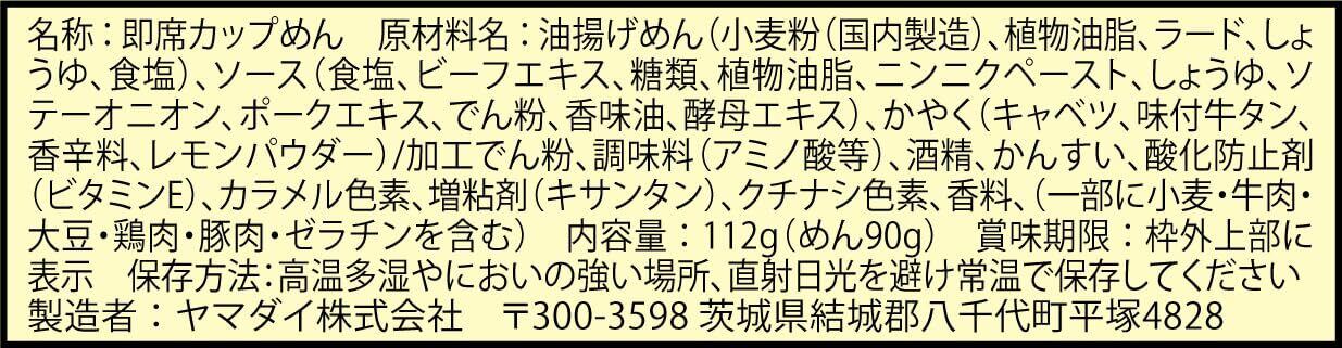 油揚げめん(小麦粉(国内製造)、植物油脂、ラード、しょうゆ、食塩)、ソース(食塩、ビーフエキス、糖類、植物油脂、ニンニクペースト、しょうゆ、ソテーオニオン、ポークエキス、でん粉、香味油、酵母エキス)、かやく(キャベツ、味付牛タン、香辛料、レモンパウダー)/加工でん粉、調味料(アミノ酸等)、酒精、かんすい、酸化防止剤(ビタミンE)、カラメル色素、増粘剤(キサンタン)、クチナシ色素、香料、(一部に小麦・牛肉・大豆・鶏肉・豚肉・ゼラチンを含む)