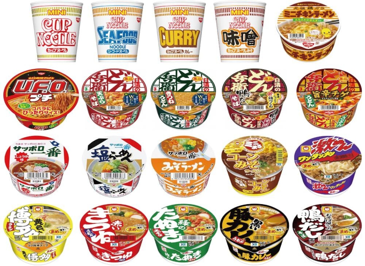 内容 日清カップヌードル カップヌードル ミニ, 日清カップヌードル シーフード ミニ, 日清カップヌードル カレー ミニ, 日清カップヌードル 味噌 ミニ, 日清 どん兵衛 きつねうどん ミニ, 日清 どん兵衛 天ぷらそば ミニ, 日清 どん兵衛 鴨だしそば ミニ, 日清 どん兵衛 温つゆおそうめんミニ, 日清 チキンラーメン ミニ, 日清 UFO ミニ, サッポロ一番 しょうゆ味ミニどんぶり, サッポロ一番 みそラーメンミニどんぶり, サッポロ一番 塩味味ミニどんぶり, マルちゃん 赤いまめきつねうどん, マルちゃん 黒いまめ豚カレーうどん, マルちゃん 緑のまめたぬき天そば, マルちゃん おそば屋さんのまめ鴨だしそば, 黄色いまめ博多ラーメン, まめ激めんワンタンメン, ミニまる コーンみそラーメン バター風味