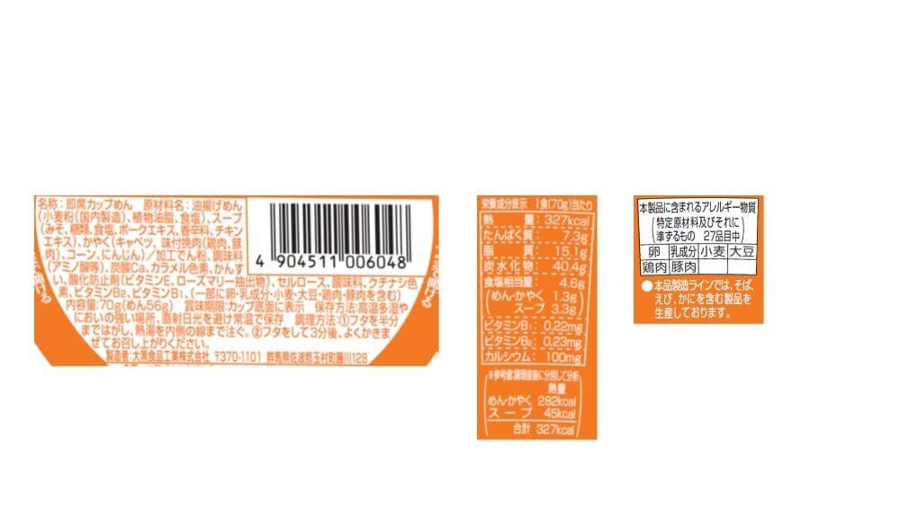 原材料:油揚げめん(小麦粉(国内製造)、植物油脂、食塩)、スープ(みそ、糖類、食塩、ポークエキス、香辛料、チキンエキス)、かやく(キャベツ、味付挽肉(鶏肉、豚肉)、コーン、にんじん)/加工でん粉、調味料(アミノ酸等)、炭酸Ca、カラメル色素、かんすい、酸化防止剤(ビタミンE、ローズマリー抽出物)、セルロース、酸味料、クチナシ色素、ビタミンB2、ビタミンB1、(一部に卵・乳成分・小麦・大豆・鶏肉・豚肉を含む)