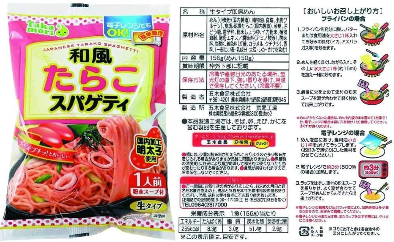 【和風たらこ】めん[小麦粉(国内製造)、植物油、食塩、小麦グルテン]、食塩、乾燥たらこ(国内製造)、砂糖、ぶどう糖、香辛料、粉末しょうゆ、イカ粉末、植物油脂、酵母エキス/調味料(アミノ酸等)、酸味料、炭酸K、着色料(紅麴、カラメル、クチナシ)、香料、(一部に小麦・乳成分・大豆・いか・さけを含む))[栄養成分表示1食(156g)当たり]エネルギー265kcal、たんぱく質8.3g、脂質3.0g、炭水化物51.4g、食塩相当量2.6g[製品に含まれるアレルギー物質]小麦・乳成分・大豆・いか・さけ