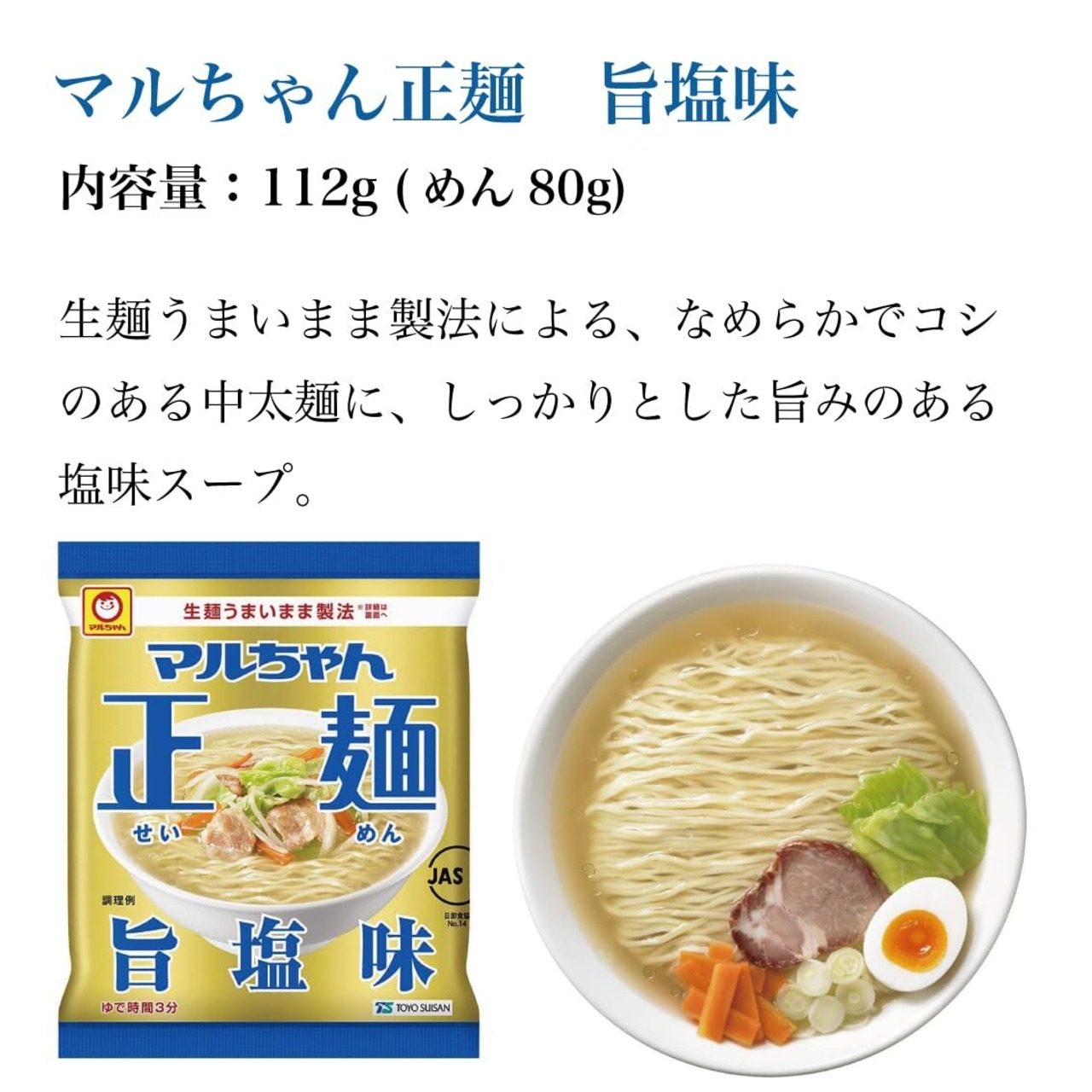 「マルちゃん正麺 旨塩味」生麺うまいまま製法による、なめらかでコシのある中太麺に、しっかりとした旨みのある塩味スープ。