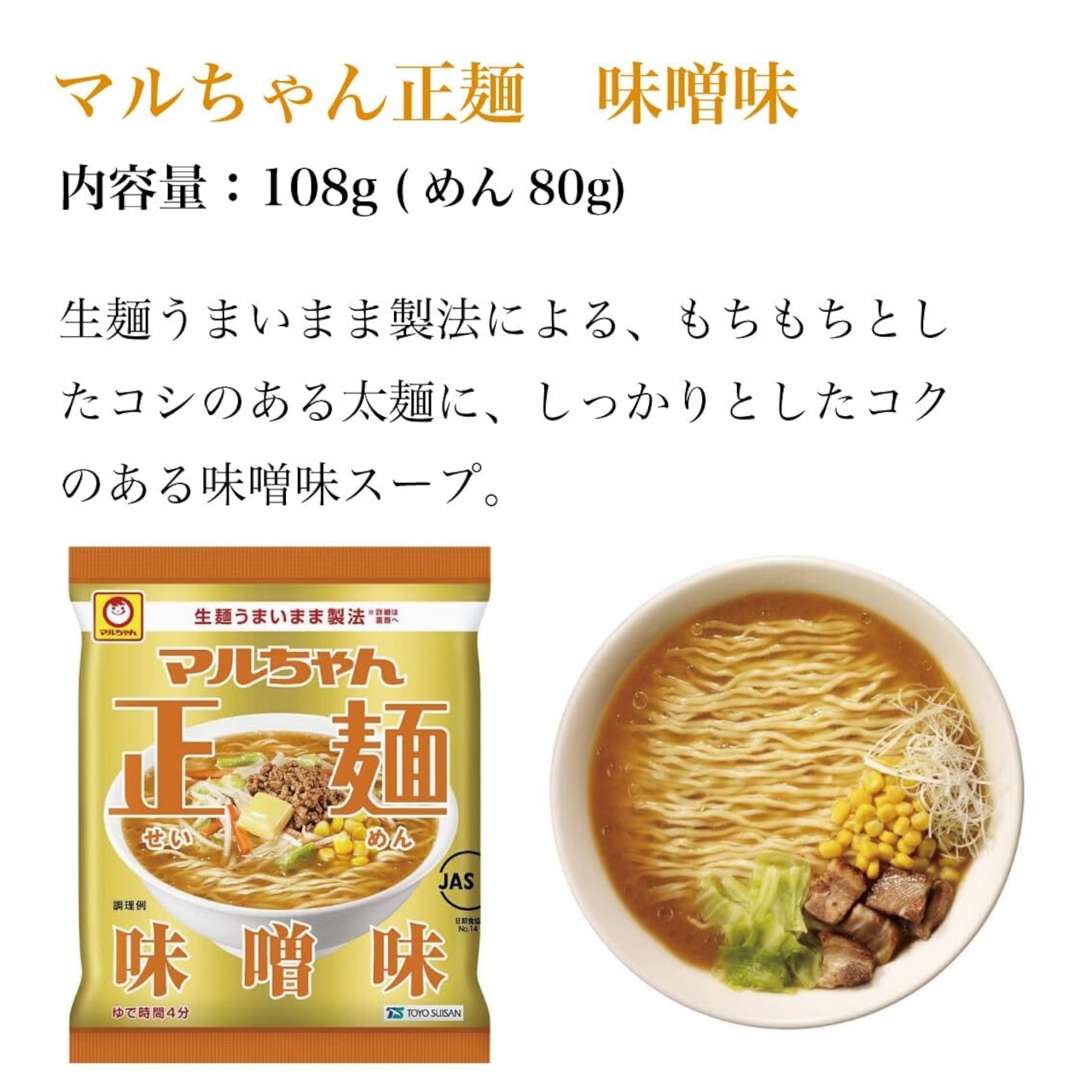 「マルちゃん正麺 味噌味」生麺うまいまま製法による、もちもちとしたコシのある太麺に、しっかりとしたコクのある味噌味スープ。