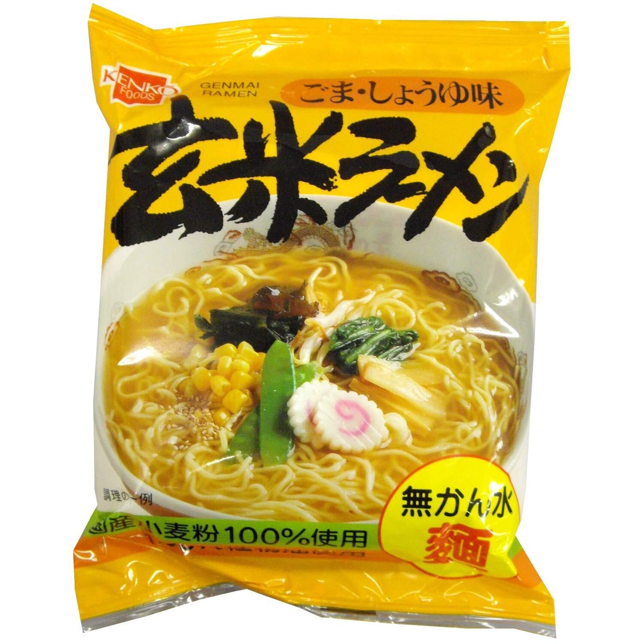 健康フーズの玄米ラーメン100g×10個は、原材料: 油揚げめん[小麦粉(国内製造)、植物油脂、玄米粉、小麦たん白、でん粉、食塩]、添付調味料[食塩、粉末しょうゆ、ごま、酵母エキスパウダー、デキストリン、砂糖、魚醤粉末(魚介類)、香辛料、ごま油、麦芽エキス、えび粉末、乾燥ねぎ、するめパウダー]/卵殻カルシウム、酸化防止剤(ビタミンE)