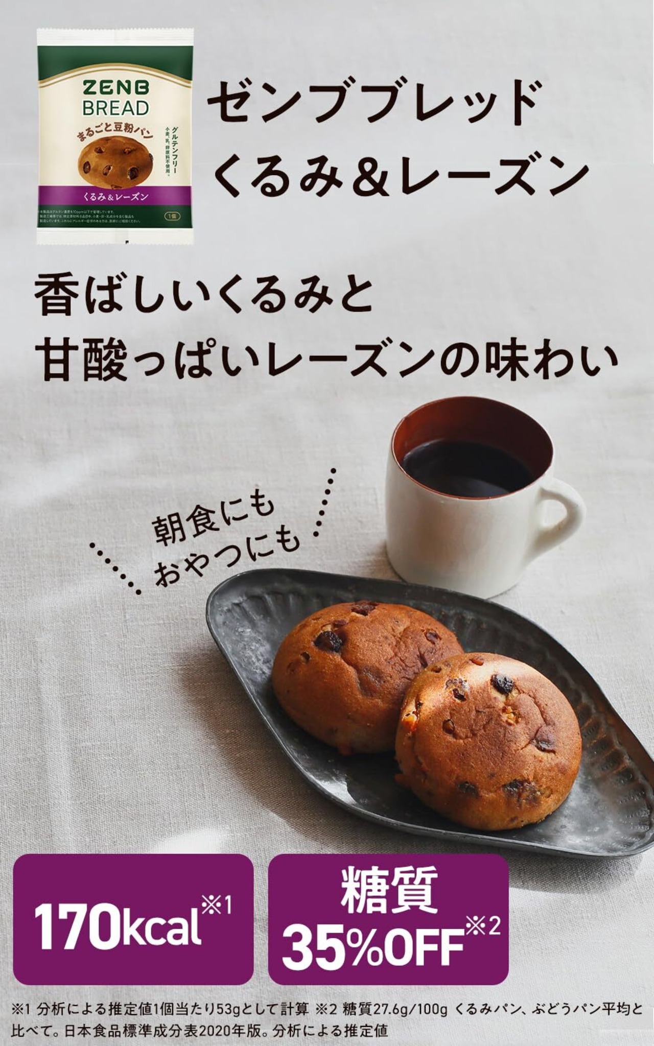 【糖質オフ*1&グルテンフリー*2】余計なものは加えず、素材のおいしさを活かしました。小麦粉不使用*2 、卵、バター、乳製品などの動物性原料も加えていません*2 。白砂糖も使わず、てんさい糖を使用しています。( *1 いつものパンに比べて26%オフ ゼンブブレッド6品糖質量(100gあたり):24.8~38.8g。くるみ&レーズン:くるみパン・ぶどうパン平均、カカオ・紅茶&オレンジ・金時豆:菓子パン(あんなし)、きなこあん:菓子パン(こしあん入り)と比べて。日本食品成分表2020年。3種の雑穀:食パンと比べて。日本食品標準成分表2015年。分析による推定値。*2: 本製品はグルテン濃度を10ppm以下で管理しています。製造工場等では、特定原材料8品目中、くるみ・小麦・卵・乳成分を含む製品も製造しています。これらにアレルギー症状のある方は、医師にご相談ください。)