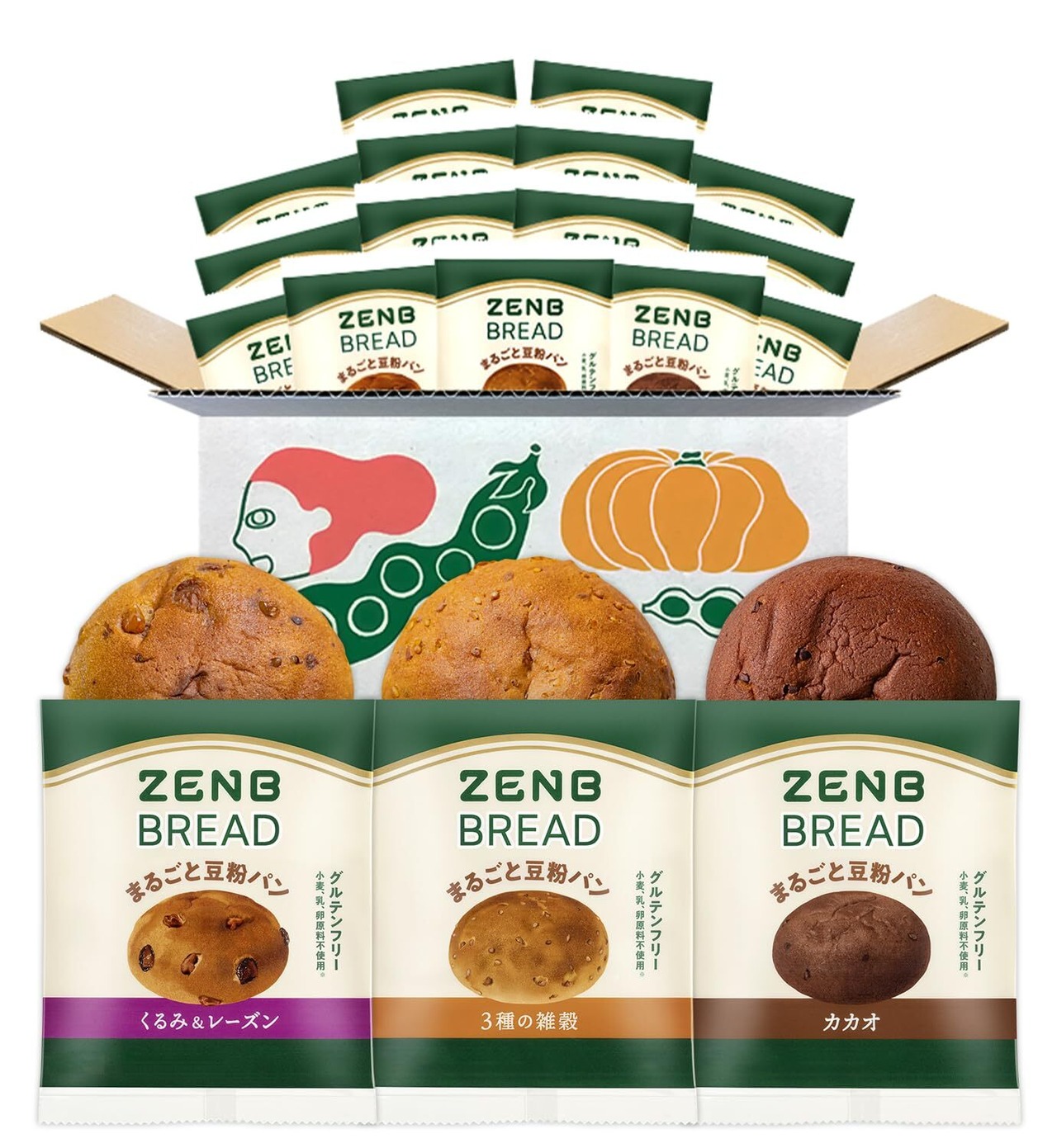 【糖質オフの豆粉パン】ZENB ゼンブ ブレッド グルテンフリー 3種18個 (くるみ&レーズン・カカオ・3種の雑穀 各6個) [ 糖質オフ 糖質制限 糖質コントロール 腸活 時の 食物繊維 補給に ダイエット 時の栄養補給に 置き換え ロングライフパン たんぱく質 食物繊維 鉄分 ビタミンB1 非常食 小腹がすいた時に食べる 常温保存 長期保存 ]