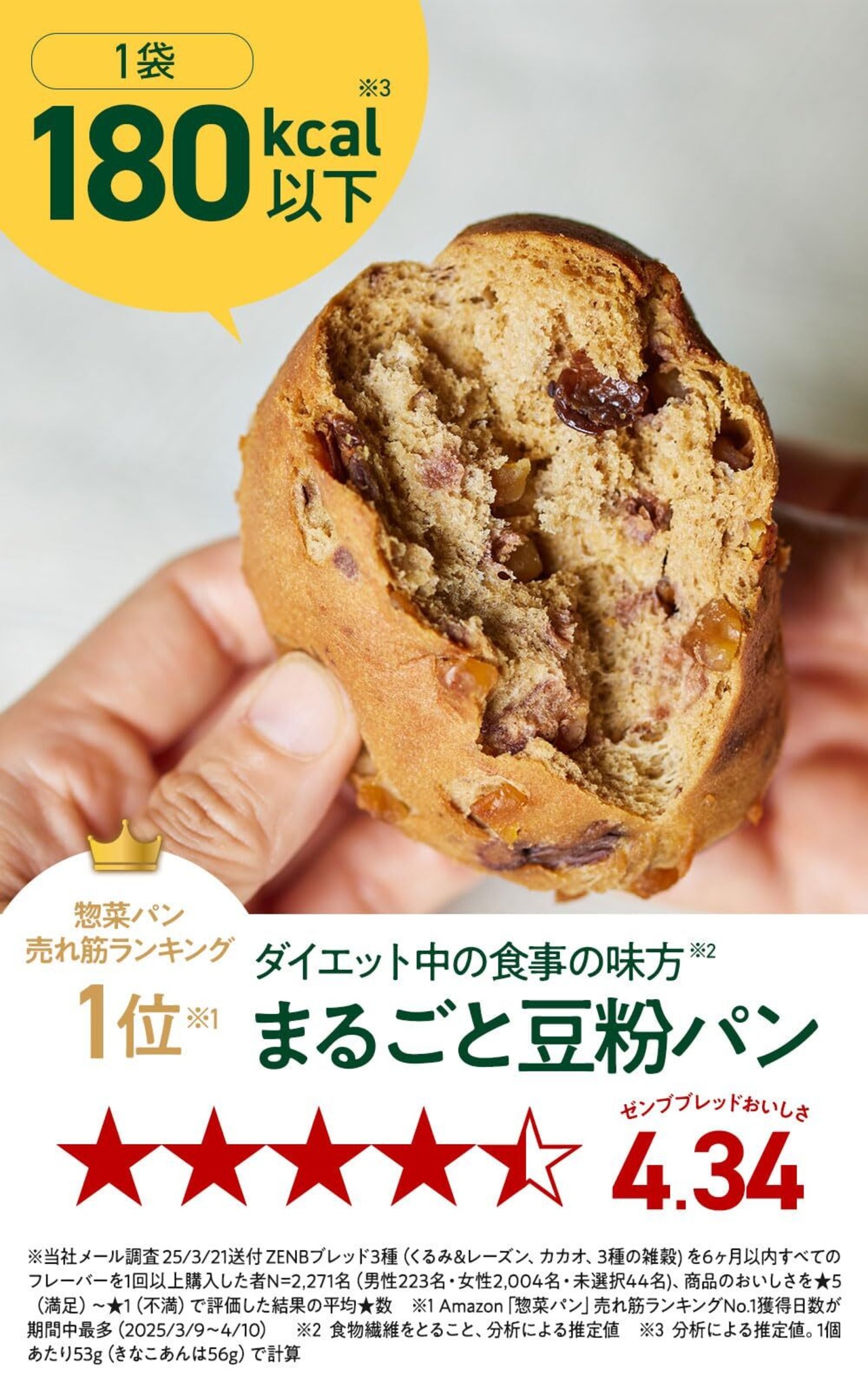 【ダイエット中・腸活中の栄養補給に】ゼンブブレッドはいつものパンより、糖質26%オフ*、食物繊維4.8倍*1、ビタミンB1 2.7倍*1 、鉄2.2倍*1 、たんぱく質(プロテイン)入り。いろいろな栄養がとれるのに、1袋180kcal*3以下。常温で保管出来て袋を開ければすぐ食べられるので、毎日の朝食や間食に。*3 分析による推定値。1個当たり53g(きなこあんは56g)として計算)