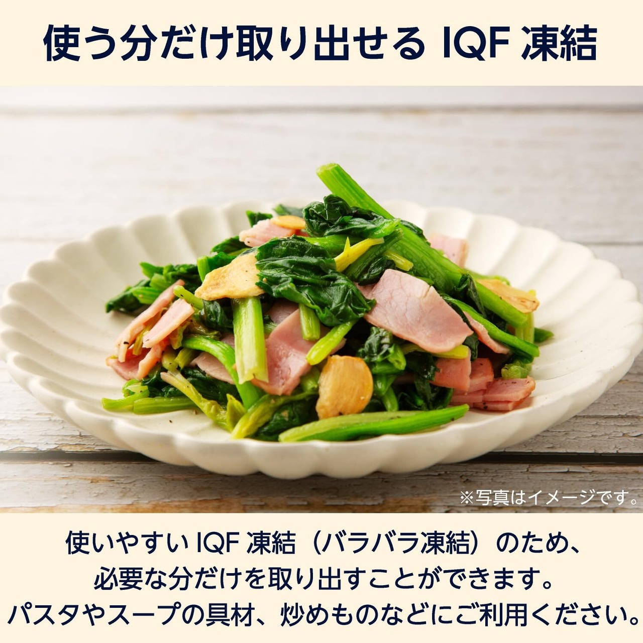 by 冷凍ほうれん草は旬の時期に収穫されたほうれん草を、使いやすいIQF凍結(バラバラ凍結)で冷凍しています。みそ汁やパスタ、炒めものなど幅広い料理にご利用いただけます。 1. IQF凍結なので、使いたい分だけを取り出してご利用いただけます。 2. 1kgの大容量 3. 旬の時期に収穫されたほうれん草を使いやすいサイズにカットし、軽く湯通しして冷凍しています。 4. 指定の契約農場で栽培された原料を使用しており、産地から一貫した管理を行っております。