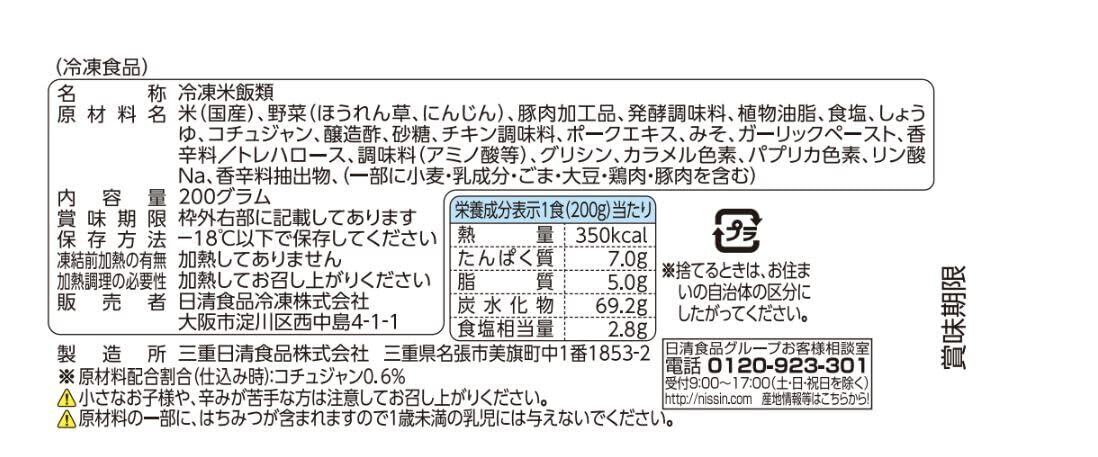 米(国産)、野菜(ほうれん草、にんじん)、豚肉加工品、発酵調味料、植物油脂、食塩、しょうゆ、コチュジャン、醸造酢、砂糖、チキン調味料、ポークエキス、みそ、ガーリックペースト、香辛料/トレハロース、調味料(アミノ酸等)、グリシン、カラメル色素、パプリカ色素、リン酸Na、香辛料抽出物、(一部に小麦・乳成分・ごま・大豆・鶏肉・豚肉を含む)