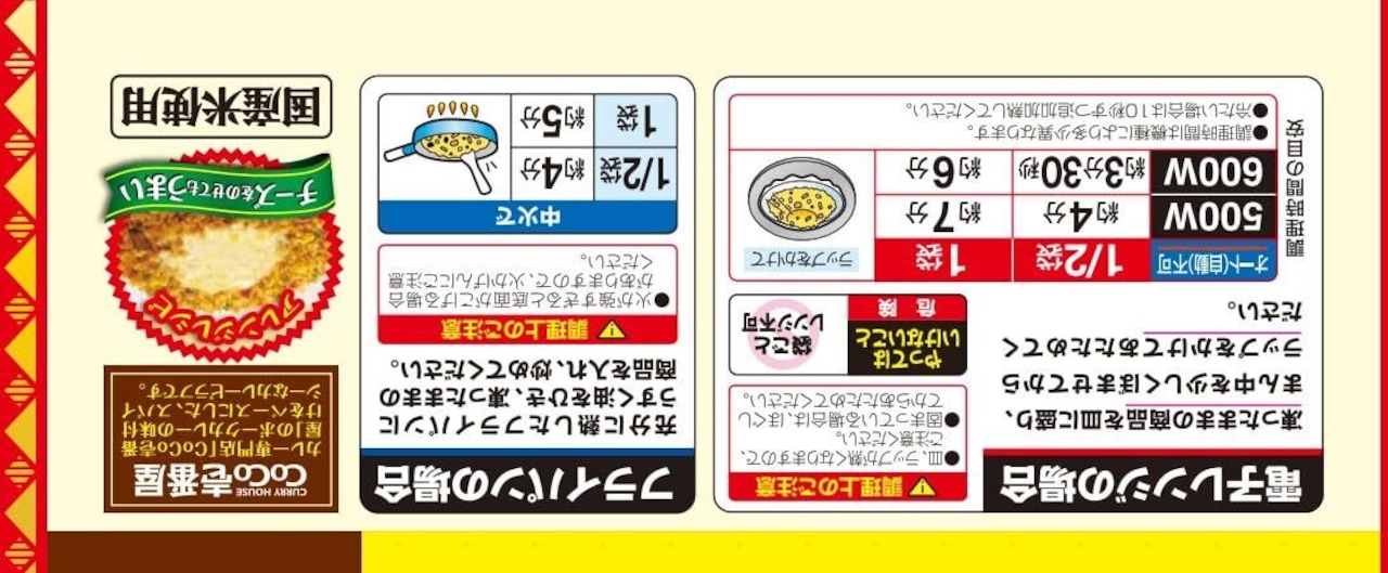 原材料:米(国産)、野菜(コーン、ピーマン、赤ピーマン、たまねぎ)、豚肉、ポークエキス、植物油脂、砂糖、トマトペースト、食塩、加工油脂、はちみつ、カレー粉、香辛料、ウスターソース、りんごピューレー、ラード、カレールウ、しょうゆ、醸造酢、スパイス加工品(とび辛スパイス)、チキンエキス、かにエキス、えびエキス/調味料(アミノ酸等)、カラメル色素、香料、加工でん粉、増粘剤(グァー)、乳化剤、酸味料、香辛料抽出物、(一部にえび・かに・小麦・卵・乳成分・大豆・鶏肉・豚肉・りんごを含む)