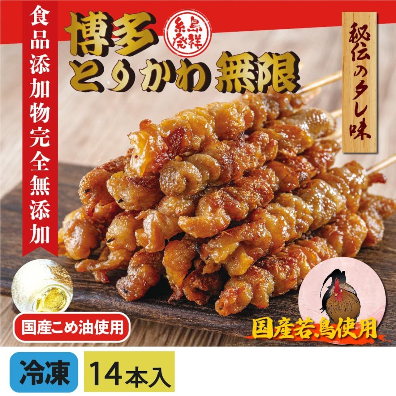 博多浜や とりかわ串 無限 14本入(7本×2袋)国産 鶏皮 無添加 冷凍 焼き鳥 甘辛タレ 居酒屋風 おつまみ 簡単調理 電子レンジOK