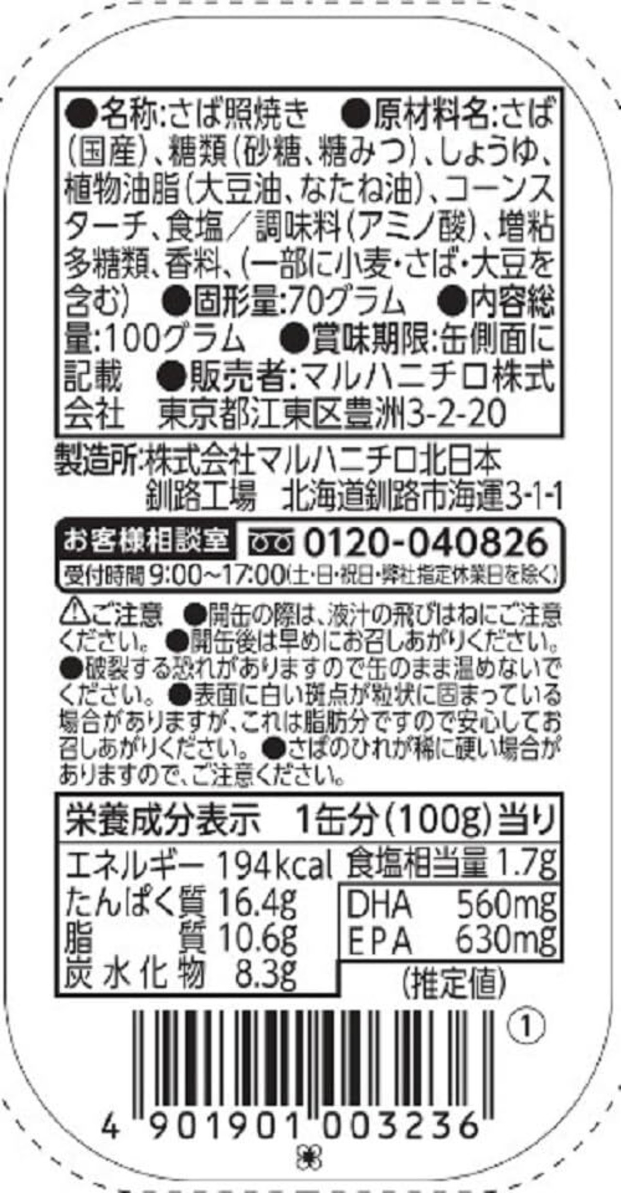 切り口で手を切らないようにご注意ください。開缶の際は、液汁の飛びはねにご注意ください。開缶後は早めにお召しあがりください。破裂する恐れがありますので缶のまま温めないでください。さばのひれが稀に硬い場合がありますので、ご注意ください。表面に白い斑点が粒状に固まっている場合がありますが、これは脂肪分ですので安心してお召しあがりください。