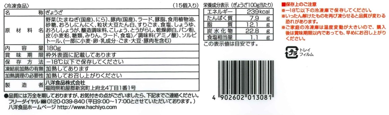 野菜〔たまねぎ(国産)、にら〕、豚肉(国産)、ラード、豚脂、食用植物油(大豆油、ごま油)、砂糖、おろしにんにく、粒状大豆たん白、食塩、ごま、しょうゆ、おろししょうが、米発酵調味料、こしょう、とうがらし、皮〔小麦粉(国内製造)、糖類(麦芽糖、ぶどう糖)、ラード、みりん、食塩〕/調味料(アミノ酸)、ソルビトール、(一部に小麦・豚肉・ごま・大豆を含む)