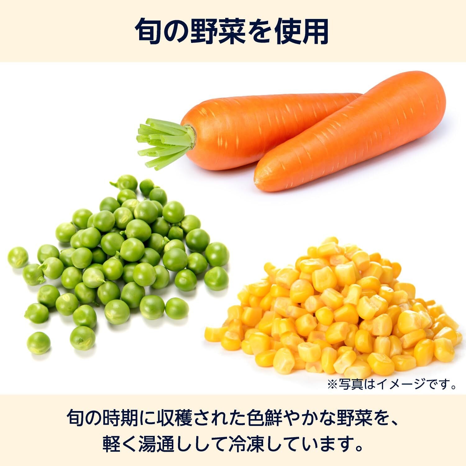 原材料名 にんじん、グリーンピース、コーン 栄養成分 エネルギー73kcal、たんぱく質2.9g、脂質0.7g、炭水化物14.3g、食塩相当量0.1g