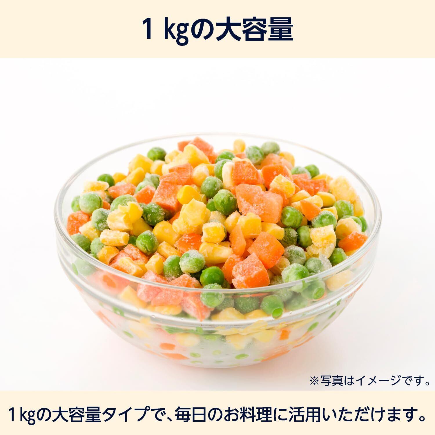 by 冷凍ミックスベジタブルは旬の時期に収穫された人参、グリーンピース、コーンを、ミックスして冷凍しています。 ピラフの具材やオムレツ、オムライスにご利用いただけます。 1. IQF凍結なので、使いたい分だけを取り出してご利用いただけます。 2. 1kgの大容量 3. 旬の時期に収穫された色鮮やかな原料を、軽く湯通しして冷凍しています。 4. 指定の契約農場で栽培された原料を使用しており、産地から一貫した管理を行っております。