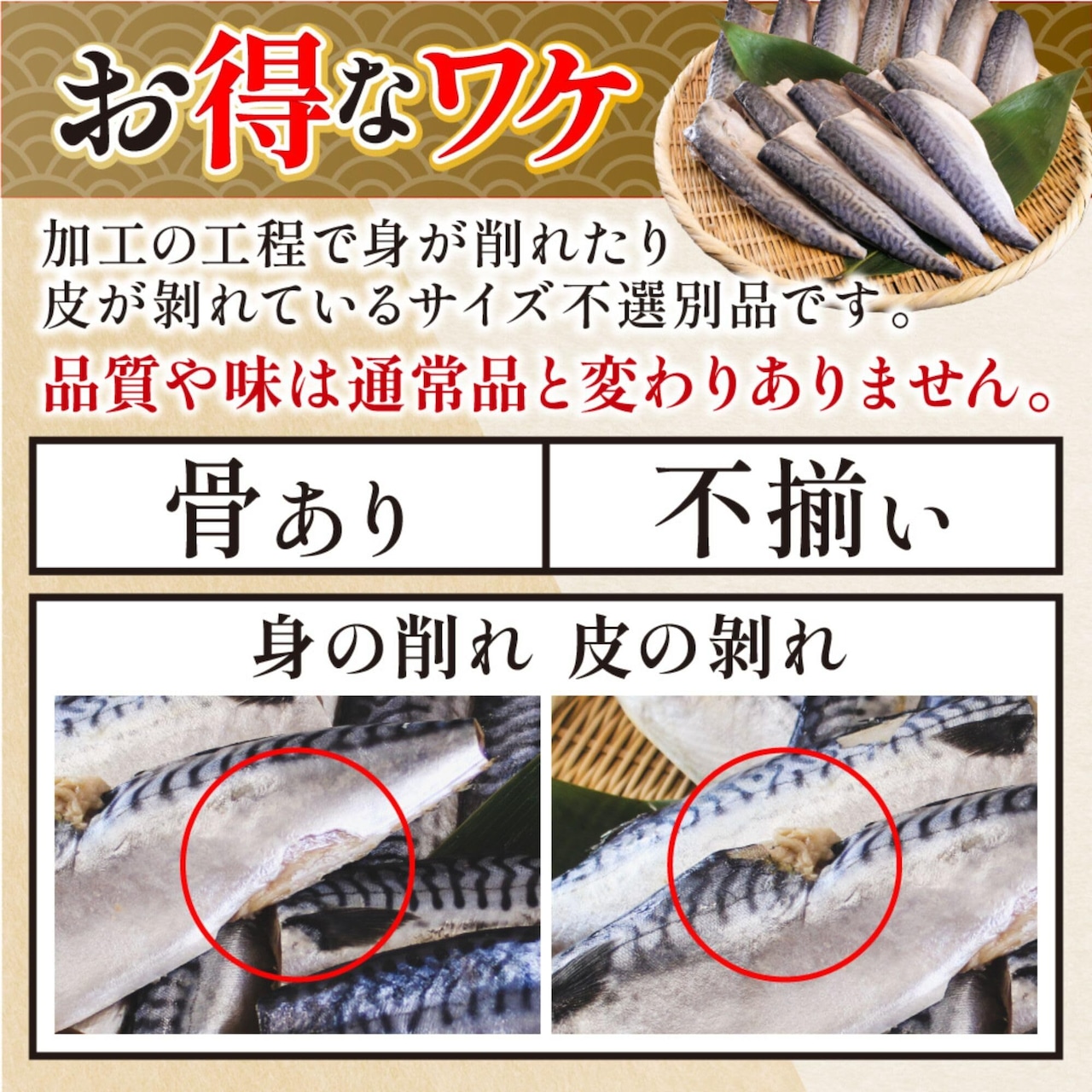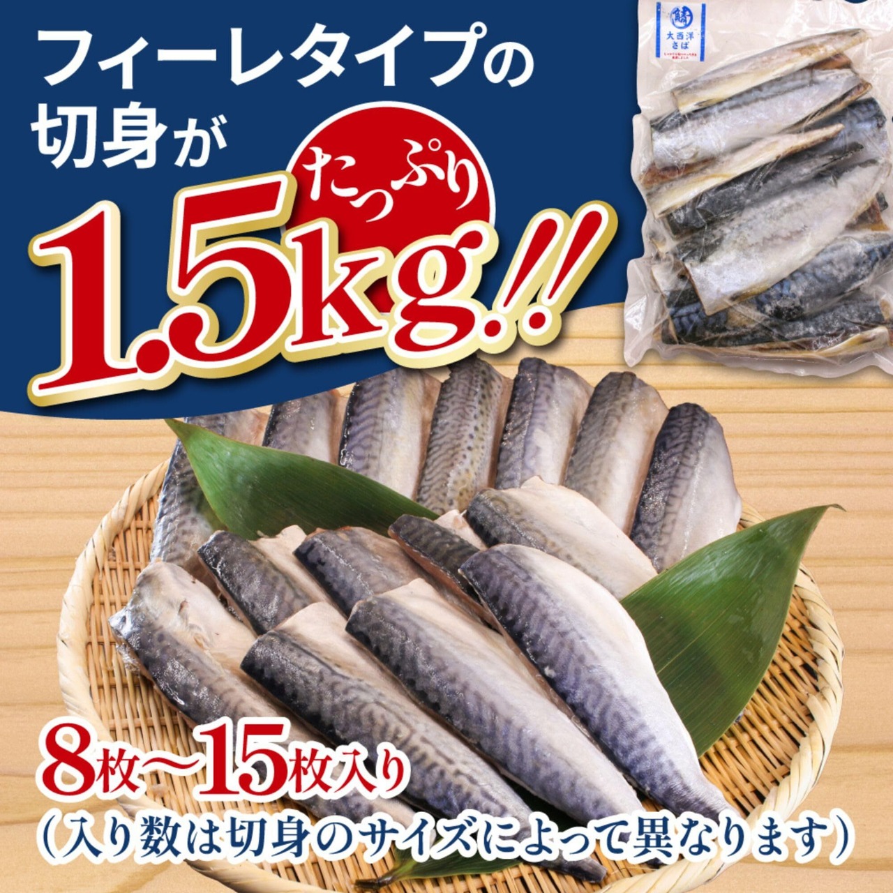 【わけあり大容量】魚体に傷アリ、サイズ無選別の塩サバフィーレです。同一の袋の中に大小様々なサイズの切り身がたっぷり入っています。約1.5kgの大容量で、コストパフォーマンスも◎ご家庭用から業務用まで、様々なシーンでご利用いただけます。※時期によりサイズにばらつきがあります。