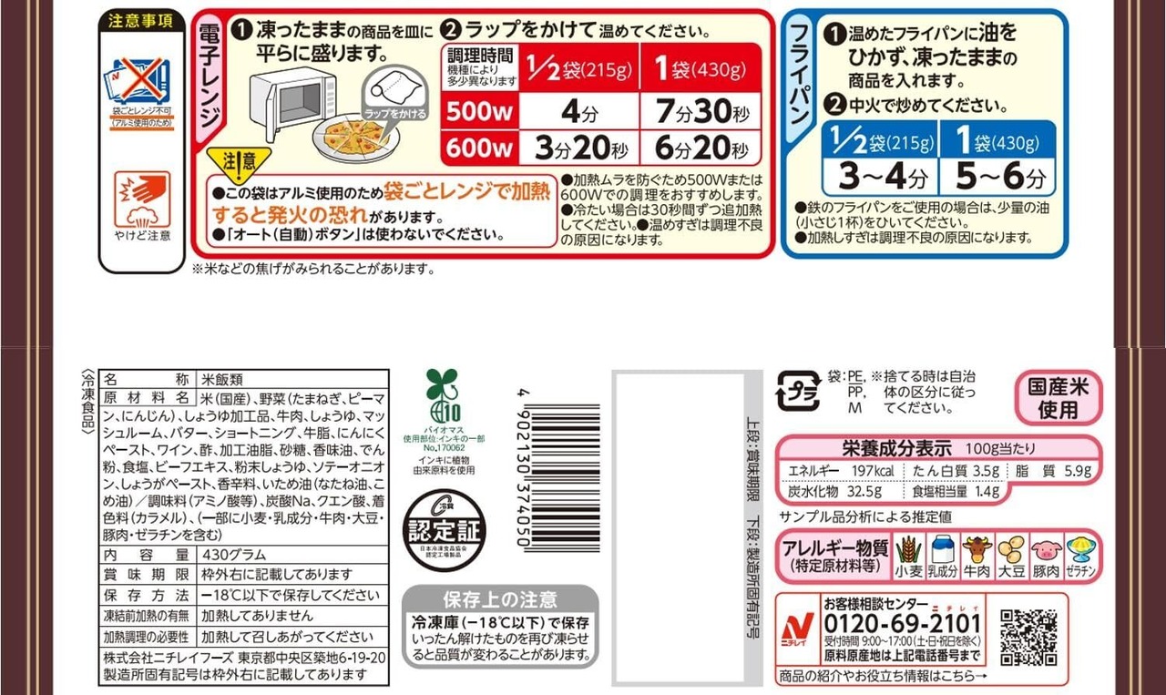 米(国産)、野菜(たまねぎ、ピーマン、にんじん)、牛肉、しょうゆ加工品、しょうゆ、鶏卵、マッシュルーム、バター、ワイン、牛脂、にんにくペースト、酢、ショートニング、加工油脂、砂糖、香味油、でん粉、ビーフエキス、食塩、粉末しょうゆ、しょうがペースト、ソテーオニオン、香辛料、いため油(なたね油、こめ油)/調味料(アミノ酸等)、炭酸Na、クエン酸、着色料(カラメル)、香辛料抽出物、(一部に小麦・卵・乳成分・牛肉・大豆・豚肉・ゼラチンを含む)